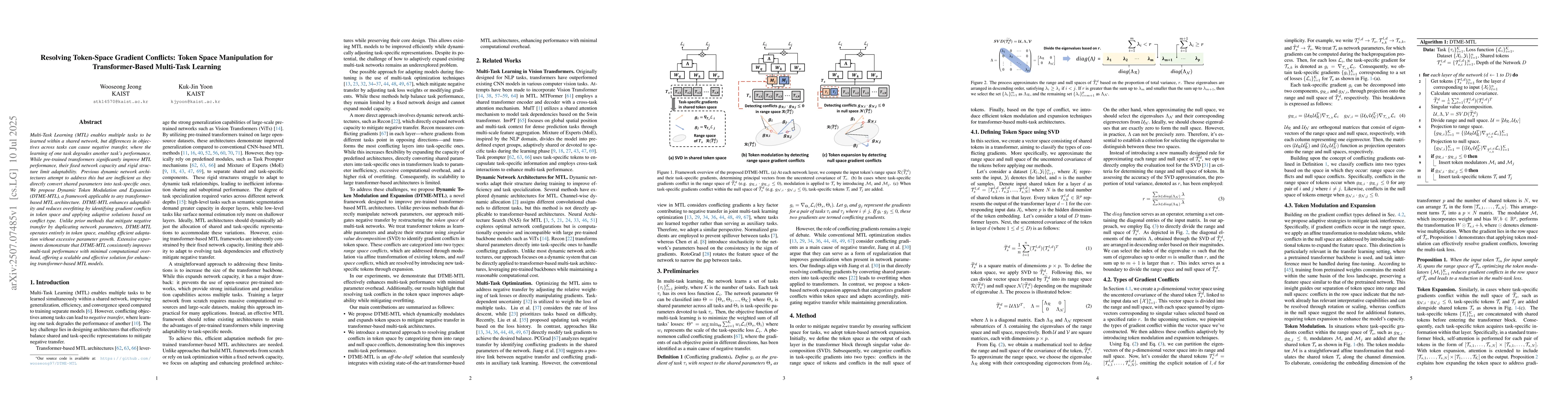 Multi-Task Learning (MTL) enables multiple tasks to be learned within a shared network, but differences in objectives across tasks can cause negative transfer, where the learning of one task degrades another task's performance. While pre-trained transformers significantly improve MTL performance, their fixed network capacity and rigid structure limit adaptability. Previous dynamic network architectures attempt to address this but are inefficient as they directly convert shared parameters into task-specific ones. We propose Dynamic Token Modulation and Expansion (DTME-MTL), a framework applicable to any transformer-based MTL architecture. DTME-MTL enhances adaptability and reduces overfitting by identifying gradient conflicts in token space and applying adaptive solutions based on conflict type. Unlike prior methods that mitigate negative transfer by duplicating network parameters, DTME-MTL operates entirely in token space, enabling efficient adaptation without excessive parameter growth. Extensive experiments demonstrate that DTME-MTL consistently improves multi-task performance with minimal computational overhead, offering a scalable and effective solution for enhancing transformer-based MTL models.