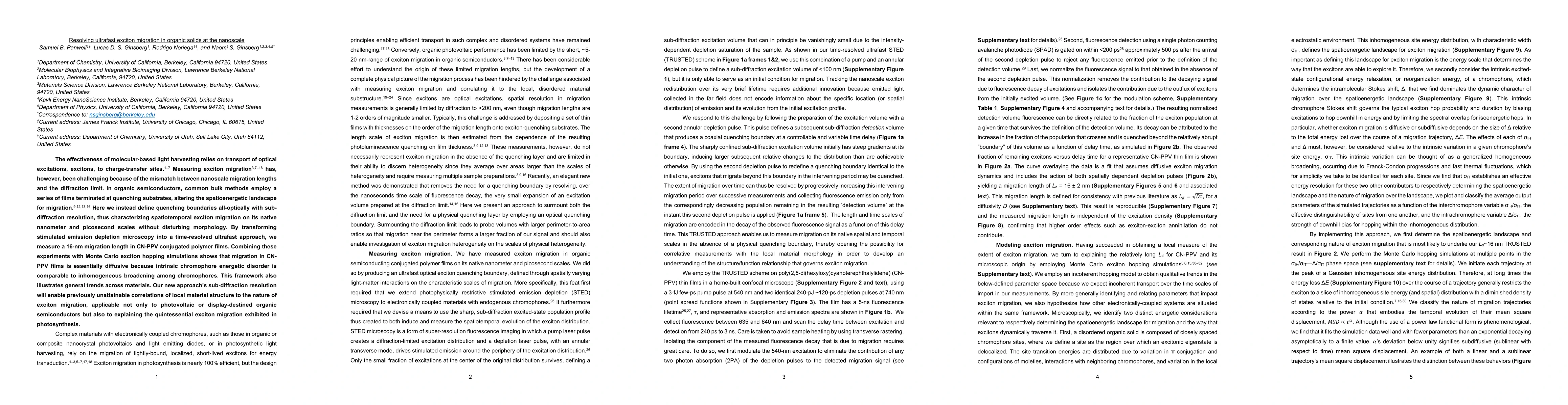 The effectiveness of molecular-based light harvesting relies on transport of optical excitations, excitons, to charg-transfer sites. Measuring exciton migration has, however, been challenging because of the mismatch between nanoscale migration lengths and the diffraction limit. In organic semiconductors, common bulk methods employ a series of films terminated at quenching substrates, altering the spatioenergetic landscape for migration. Here we instead define quenching boundaries all-optically with sub-diffraction resolution, thus characterizing spatiotemporal exciton migration on its native nanometer and picosecond scales without disturbing morphology. By transforming stimulated emission depletion microscopy into a time-resolved ultrafast approach, we measure a 16-nm migration length in CN-PPV conjugated polymer films. Combining these experiments with Monte Carlo exciton hopping simulations shows that migration in CN-PPV films is essentially diffusive because intrinsic chromophore energetic disorder is comparable to inhomogeneous broadening among chromophores. This framework also illustrates general trends across materials. Our new approach's sub-diffraction resolution will enable previously unattainable correlations of local material structure to the nature of exciton migration, applicable not only to photovoltaic or display-destined organic semiconductors but also to explaining the quintessential exciton migration exhibited in photosynthesis.