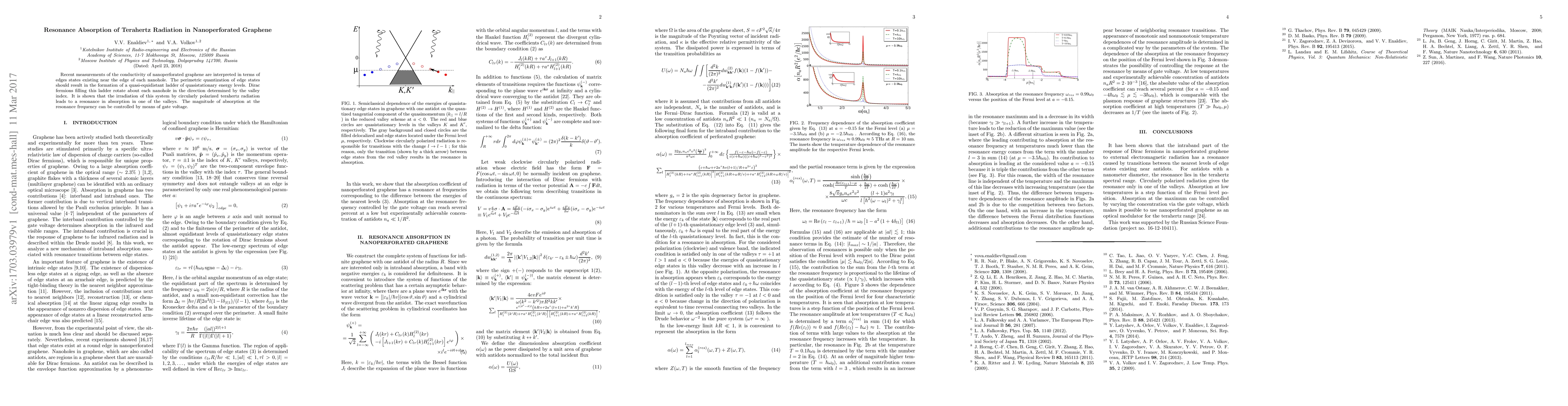 This study demonstrates that nanoperforated graphene exhibits resonance absorption of terahertz radiation due to perimetric quantization of edge states, with absorption controlled by gate voltage. Circularly polarized terahertz radiation induces resonance in one of the graphene valleys, governed by the rotation of Dirac fermions around nanoholes.