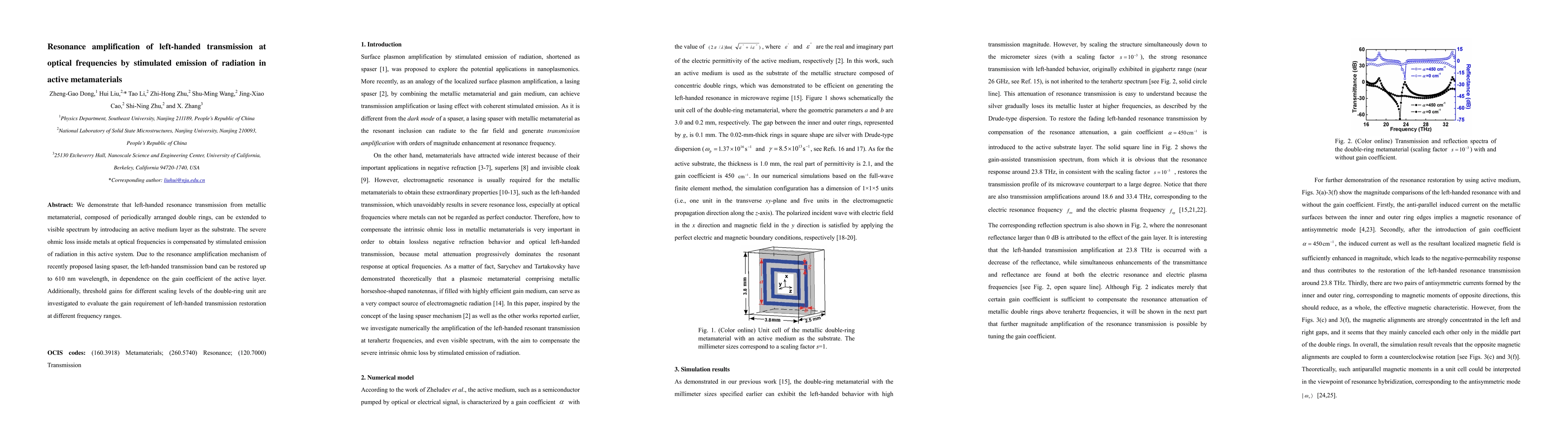 This paper demonstrates how left-handed transmission in metallic metamaterials can be extended to optical frequencies by incorporating an active medium layer, which compensates for ohmic losses through stimulated emission. The lasing spaser's resonance amplification mechanism restores the left-handed transmission band up to 610 nm, depending on the active layer's gain coefficient.