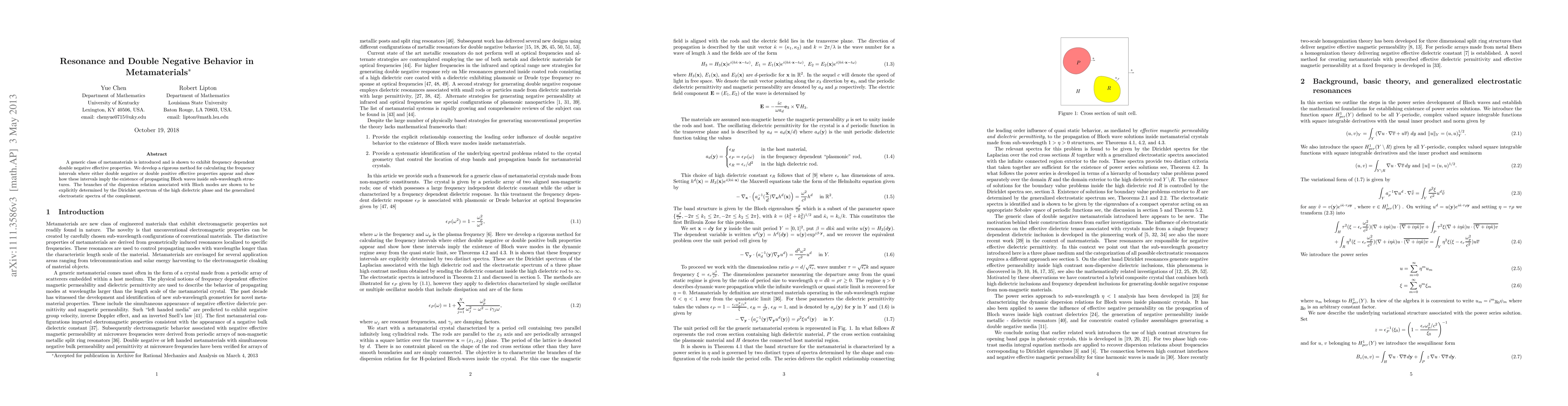 A generic class of metamaterials is introduced and is shown to exhibit frequency dependent double negative effective properties. We develop a rigorous method for calculating the frequency intervals where either double negative or double positive effective properties appear and show how these intervals imply the existence of propagating Bloch waves inside sub-wavelength structures. The branches of the dispersion relation associated with Bloch modes are shown to be explicitly determined by the Dirichlet spectrum of the high dielectric phase and the generalized electrostatic spectra of the complement.