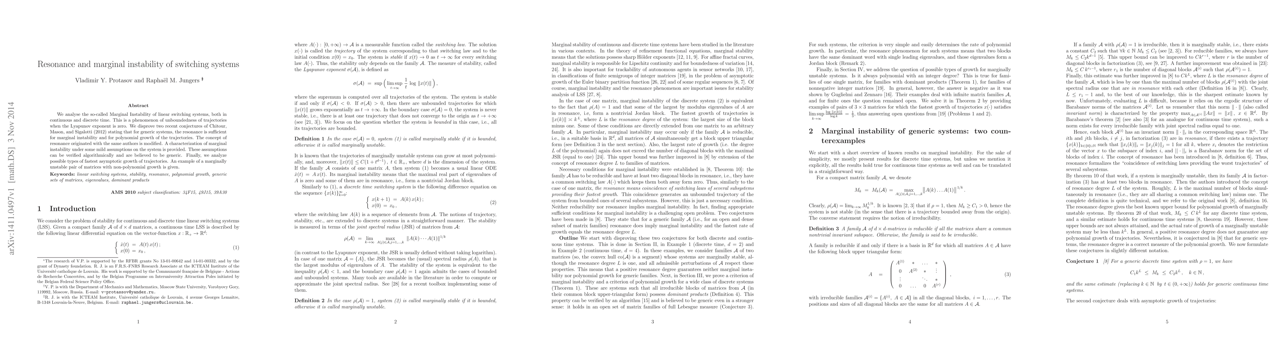 We analyse the so-called Marginal Instability of linear switching systems, both in continuous and discrete time. This is a phenomenon of unboundedness of trajectories when the Lyapunov exponent is zero. We disprove two recent conjectures of Chitour, Mason, and Sigalotti (2012) stating that for generic systems, the resonance is sufficient for marginal instability and for polynomial growth of the trajectories. We provide a characterization of marginal instability under some mild assumptions on the sys- tem. These assumptions can be verified algorithmically and are believed to be generic. Finally, we analyze possible types of fastest asymptotic growth of trajectories. An example of a pair of matrices with sublinear growth is given.