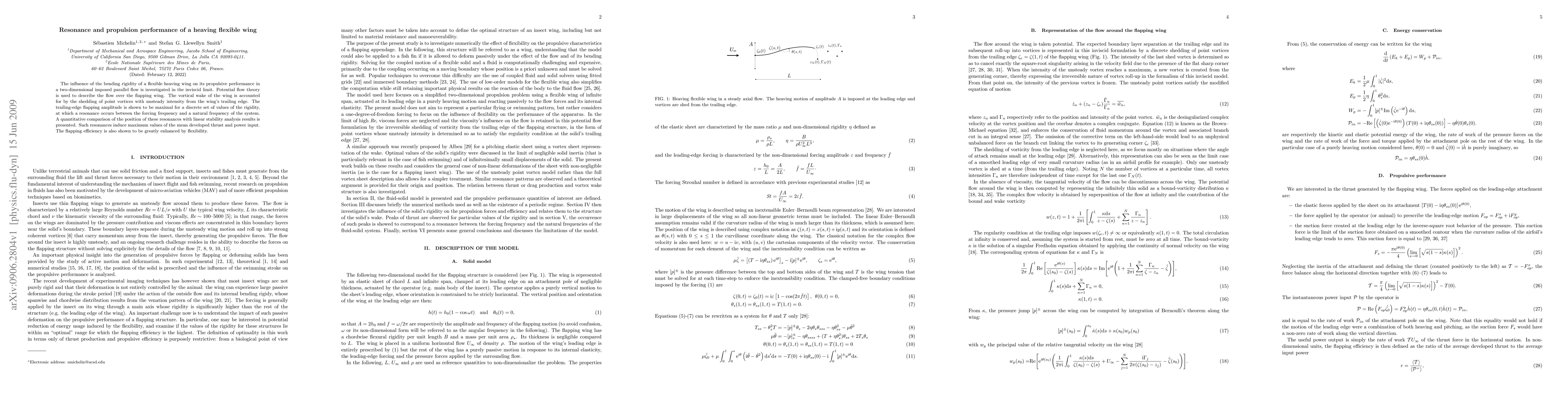 The influence of the bending rigidity of a flexible heaving wing on its propulsive performance in a two-dimensional imposed parallel flow is investigated in the inviscid limit. Potential flow theory is used to describe the flow over the flapping wing. The vortical wake of the wing is accounted for by the shedding of point vortices with unsteady intensity from the wing's trailing edge. The trailing-edge flapping amplitude is shown to be maximal for a discrete set of values of the rigidity, at which a resonance occurs between the forcing frequency and a natural frequency of the system. A quantitative comparison of the position of these resonances with linear stability analysis results is presented. Such resonances induce maximum values of the mean developed thrust and power input. The flapping efficiency is also shown to be greatly enhanced by flexibility.