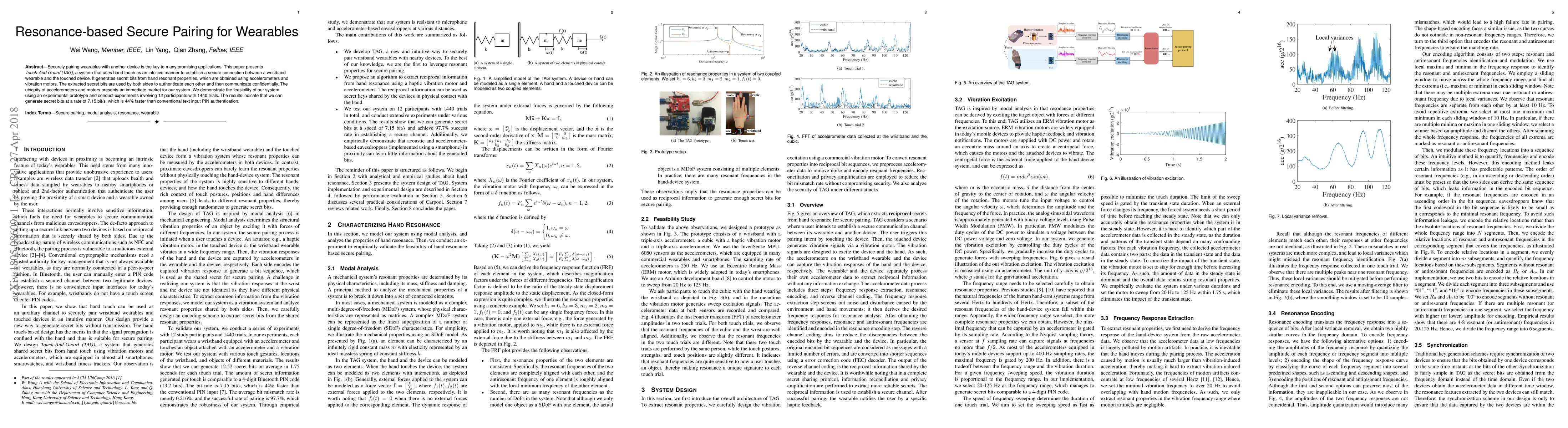 Securely pairing wearables with another device is the key to many promising applications. This paper presents \textit{Touch-And-Guard (TAG)}, a system that uses hand touch as an intuitive manner to establish a secure connection between a wristband wearable and the touched device. It generates secret bits from hand resonant properties, which are obtained using accelerometers and vibration motors. The extracted secret bits are used by both sides to authenticate each other and then communicate confidentially. The ubiquity of accelerometers and motors presents an immediate market for our system. We demonstrate the feasibility of our system using an experimental prototype and conduct experiments involving 12 participants with 1440 trials. The results indicate that we can generate secret bits at a rate of 7.15 bit/s, which is 44% faster than conventional text input PIN authentication.