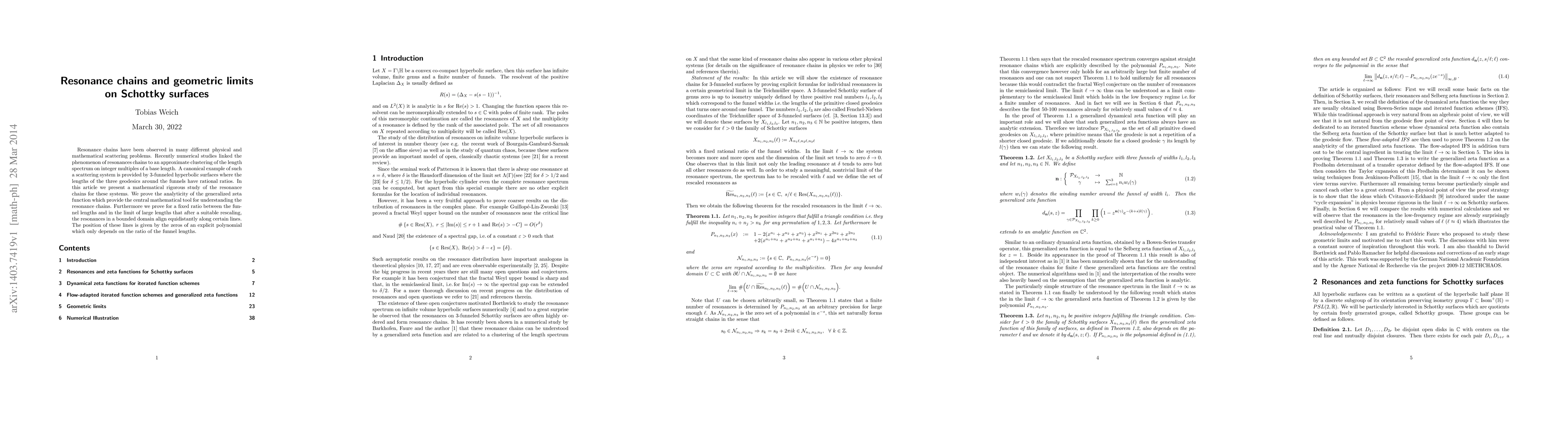 Resonance chains have been observed in many different physical and mathematical scattering problems. Recently numerical studies linked the phenomenon of resonances chains to an approximate clustering of the length spectrum on integer multiples of a base length. A canonical example of such a scattering system is provided by 3-funneled hyperbolic surfaces where the lengths of the three geodesics around the funnels have rational ratios. In this article we present a mathematical rigorous study of the resonance chains for these systems. We prove the analyticity of the generalized zeta function which provide the central mathematical tool for understanding the resonance chains. Furthermore we prove for a fixed ratio between the fun- nel lengths and in the limit of large lengths that after a suitable rescaling, the resonances in a bounded domain align equidistantly along certain lines. The position of these lines is given by the zeros of an explicit polynomial which only depends on the ratio of the funnel lengths.