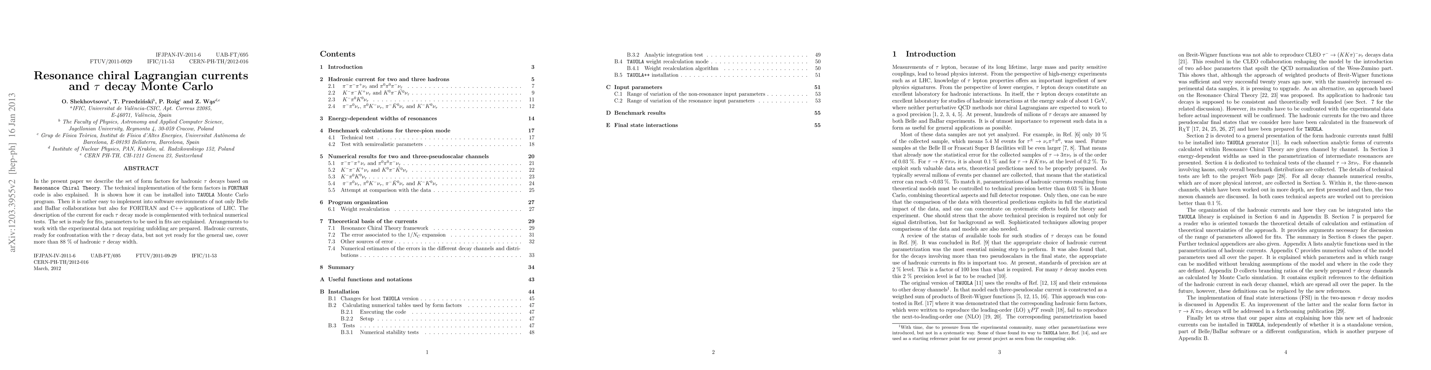 Measurements of tau lepton, because of its long lifetime, large mass and parity sensitive couplings lead to broad physics interest. From the perspective of high-energy experiments such as at LHC, knowledge of tau lepton properties offers an important ingredient of new physics signatures. From the perspective of lower energies, tau lepton decays constitute an excellent laboratory for hadronic interactions. At present,hundreds of millions of tau decays have been amassed by both Belle and BaBar experiments. It is of utmost importance to represent such data in a form as useful for general applications as possible. In the present paper we describe the set of form factors for hadronic tau decays based on Resonance Chiral Theory. The technical implementation of the form factors in FORTRAN code is also explained. It is shown how it can be installed into TAUOLA Monte Carlo program. Then it is rather easy to implement into software environments of not only Belle and BaBar collaborations but also for FORTRAN and C++ applications of LHC. Description of the current for each tau decay mode is complemented with technical numerical tests. The set is ready for fits, parameters to be used in fits are explained. Arrangements to work with the experimental data not requiring unfolding are prepared. Hadronic currents, ready for confrontation with the tau decay data, but not yet ready for the general use, cover more than 88% of hadronic tau decay width.