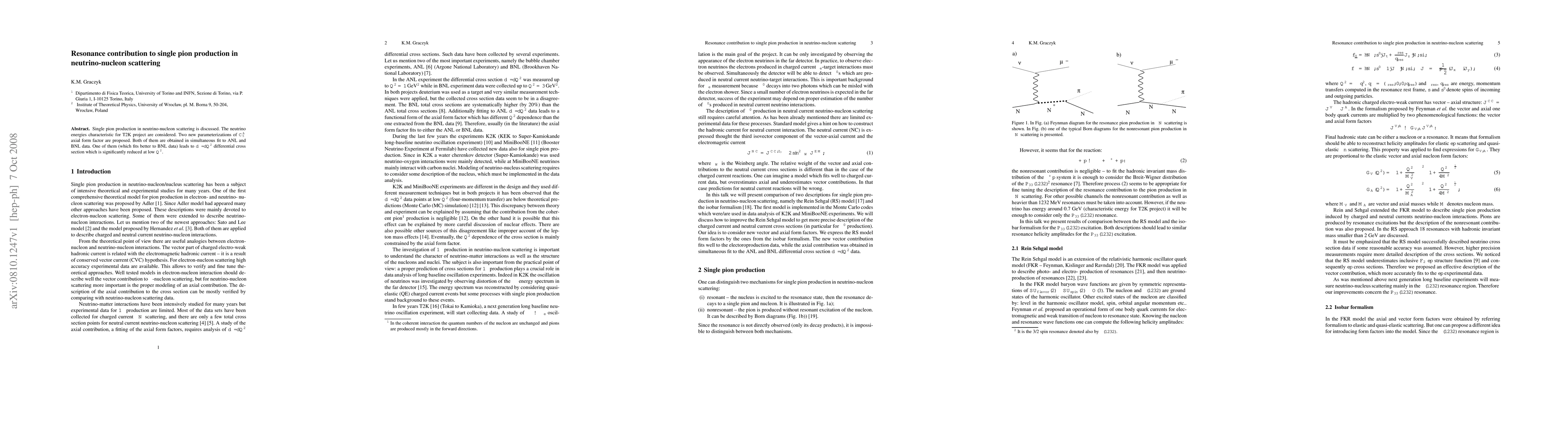 Single pion production in neutrino-nucleon scattering is discussed. The neutrino energies characteristic for T2K project are considered. Two new parameterizations of $C_5^A$ axial form factor are proposed. Both of them are obtained in simultaneous fit to ANL and BNL data. One of them (which fits better to BNL data) leads to $d\sigma/dQ^2$ differential cross section which is significantly reduced at low $Q^2$.