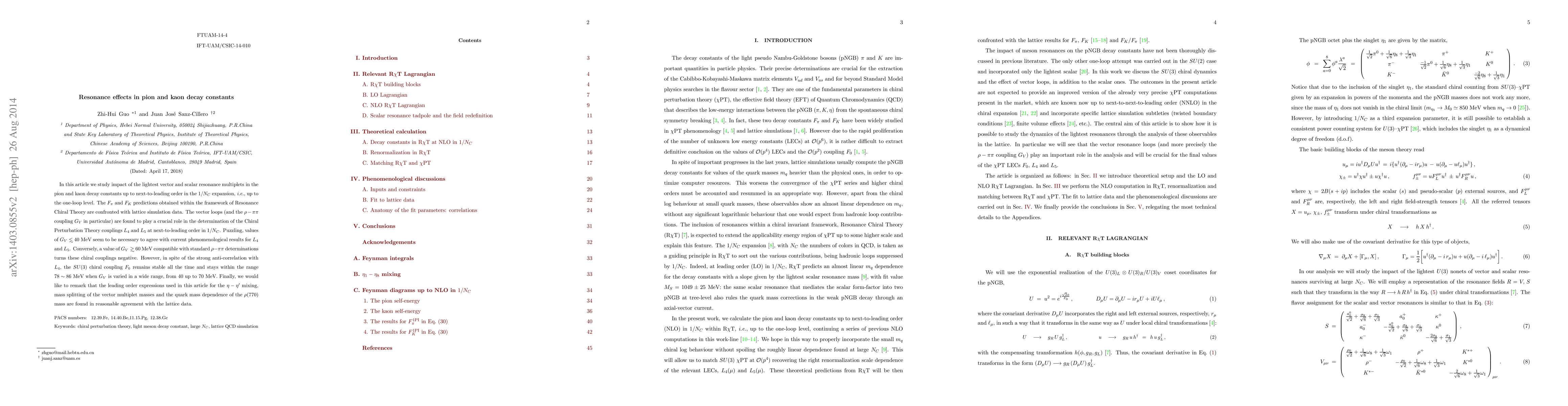 In this article we study impact of the lightest vector and scalar resonance multiplets in the pion and kaon decay constants up to next-to-leading order in the $1/N_C$ expansion, i.e., up to the one-loop level. The $F_\pi$ and $F_K$ predictions obtained within the framework of Resonance Chiral Theory are confronted with lattice simulation data. The vector loops (and the $\rho-\pi\pi$ coupling $G_V$ in particular) are found to play a crucial role in the determination of the Chiral Perturbation Theory couplings $L_4$ and $L_5$ at next-to-leading order in $1/N_C$. Puzzling, values of $G_V < 40$ MeV seem to be necessary to agree with current phenomenological results for $L_4$ and $L_5$. Conversely, a value of $G_V > 60$ MeV compatible with standard $\rho-\pi\pi$ determinations turns these chiral couplings negative. However, in spite of the strong anti-correlation with $L_4$, the $SU(3)$ chiral coupling $F_0$ remains stable all the time and stays within the range $78 \sim 86$ MeV when $G_V$ is varied in a wide range, from $40$ up to $70$ MeV. Finally, we would like to remark that the leading order expressions used in this article for the $\eta-\eta'$ mixing, mass splitting of the vector multiplet masses and the quark mass dependence of the $\rho(770)$ mass are found in reasonable agreement with the lattice data.