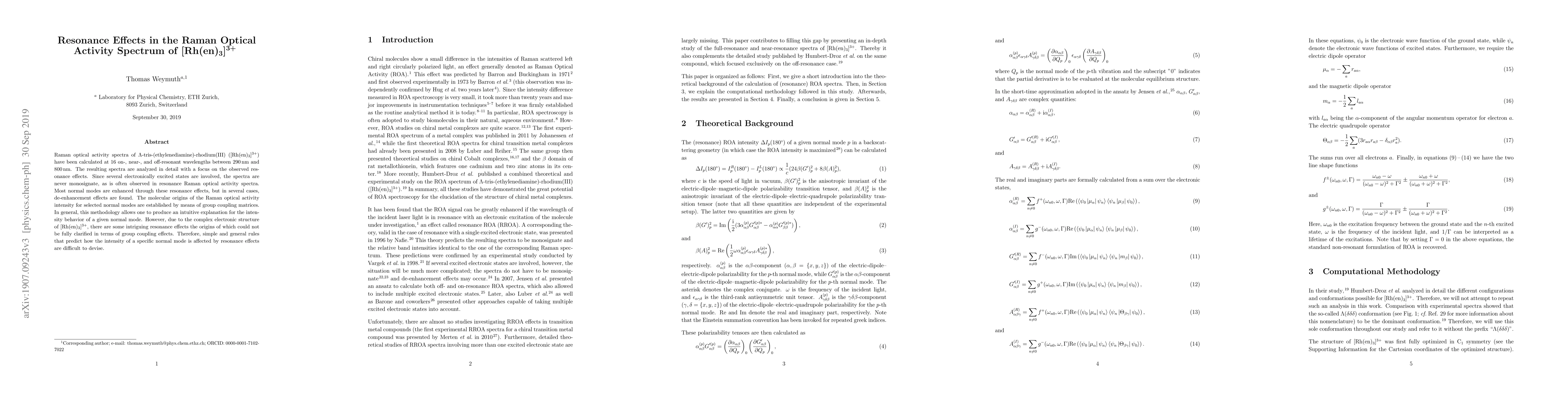 Researchers calculated Raman optical activity spectra of [Rh(en)$_3$]$^{3+}$ to understand resonance effects, finding that most normal modes are enhanced but some experience de-enhancement; a methodology for explaining intensity behavior was developed, but complex electronic structure poses challenges.