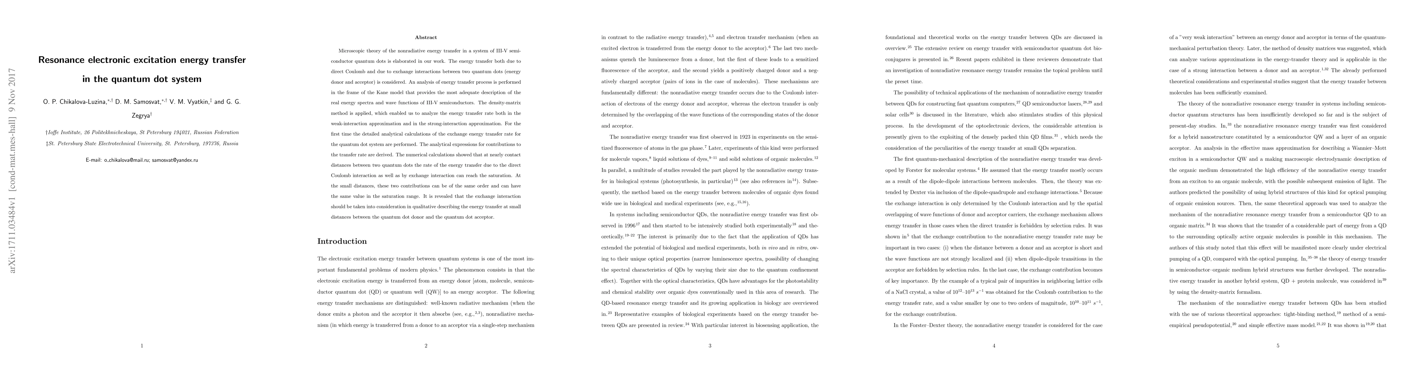 Microscopic theory of the nonradiative energy transfer in a system of III-V semiconductor quantum dots is elaborated in our work. The energy transfer both due to direct Coulomb and due to exchange interactions between two quantum dots (energy donor and acceptor) is considered. An analysis of energy transfer process is performed in the frame of the Kane model that provides the most adequate description of the real energy spectra and wave functions of III-V semiconductors. The density-matrix method is applied, which enabled us to analyze the energy transfer rate both in the weak-interaction approximation and in the strong-interaction approximation. For the first time the detailed analytical calculations of the exchange energy transfer rate for the quantum dot system are performed. The analytical expressions for contributions to the transfer rate are derived. The numerical calculations showed that at nearly contact distances between two quantum dots the rate of the energy transfer due to the direct Coulomb interaction as well as by exchange interaction can reach the saturation. At the small distances, these two contributions can be of the same order and can have the same value in the saturation range. It is revealed that the exchange interaction should be taken into consideration in qualitative describing the energy transfer at small distances between the quantum dot donor and the quantum dot acceptor.