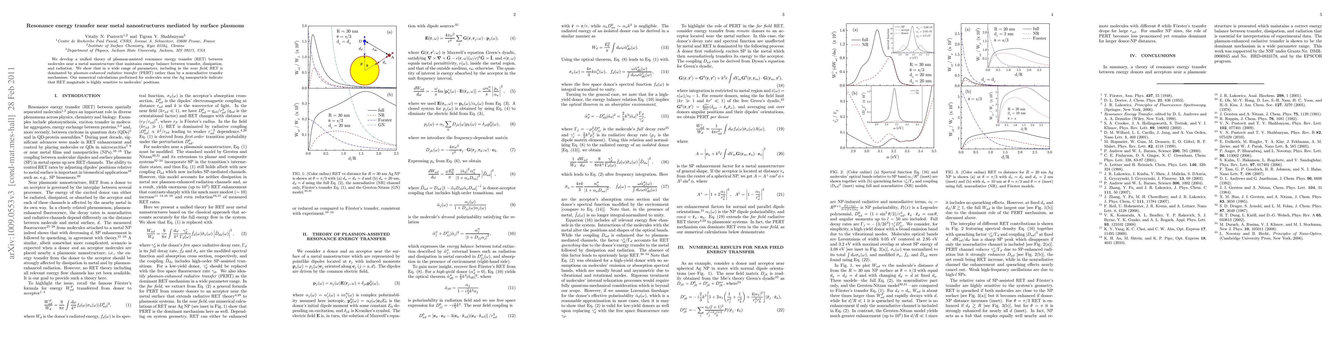 We develop a unified theory of plasmon-assisted resonance energy transfer (RET) between molecules near a metal nanostructure that maintains energy balance between transfer, dissipation, and radiation. We show that in a wide range of parameters, including in the near field, RET is dominated by plasmon-enhanced radiative transfer (PERT) rather than by a nonradiative transfer mechanism. Our numerical calculations performed for molecules near the Ag nanoparticle indicate that RET magnitude is highly sensitive to molecules' positions.
