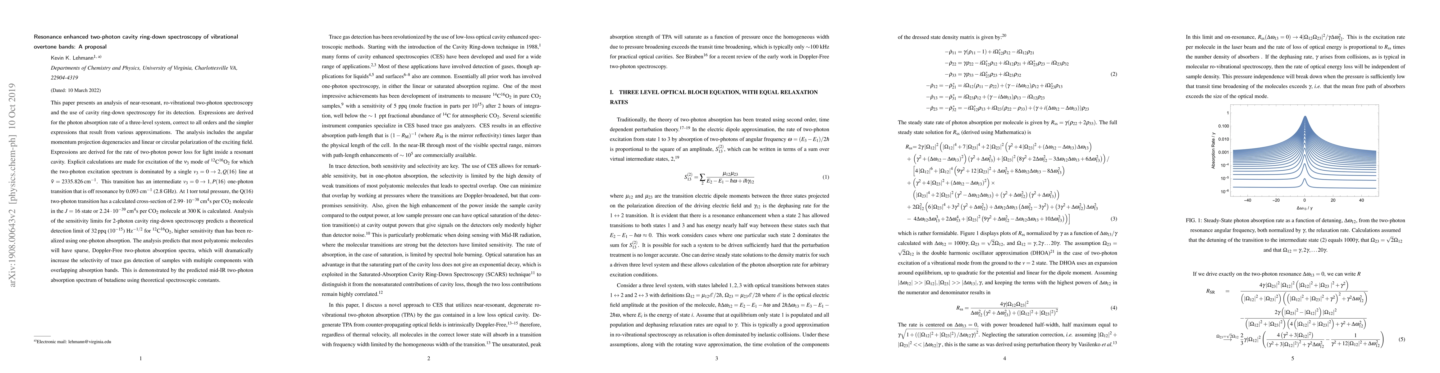 This paper presents an analysis of near-resonant, ro-vibrational two-photon spectroscopy and the use of cavity ring-down spectroscopy for its detection. Expressions are derived for the photon absorption rate of a three-level system, correct to all orders and the simpler expressions that result from various approximations. The analysis includes the angular momentum projection degeneracies and linear or circular polarization of the exciting field. Expressions are derived for the rate of two-photon power loss for light inside a resonant cavity. Explicit calculations are made for excitation of the $\nu_3$ mode of $^{12}\textrm{C}^{16}\textrm{O}_2$ for which the two-photon excitation spectrum is dominated by a single $v_3 = 0 \rightarrow 2, Q(16)$ line at $\tilde{\nu} = 2335.826$\,cm$^{-1}$. This transition has an intermediate $v_3 = 0 \rightarrow 1,P(16)$ one-photon transition that is off resonance by 0.093 cm$^{-1}$ (2.8 GHz). At 1\,torr total pressure, the Q(16) two-photon transition has a calculated cross-section of $2.99 \cdot 10^{-38}$\,cm$^4$s per CO$_2$ molecule in the $J = 16$ state or $2.24 \cdot 10^{-39}$\,cm$^4$s per CO$_2$ molecule at 300\,K is calculated. Analysis of the sensitivity limits for 2-photon cavity ring-down spectroscopy predicts a theoretical detection limit of 32\,ppq ($10^{-15}$) Hz$^{-1/2}$ for $^{12}\textrm{C}^{16}\textrm{O}_2$, higher sensitivity than has been realized using one-photon absorption. The analysis predicts that most polyatomic molecules will have sparse, Doppler-Free two-photon absorption spectra, which will dramatically increase the selectivity of trace gas detection of samples with multiple components with overlapping absorption bands. This is demonstrated by the predicted mid-IR two-photon absorption spectrum of butadiene using theoretical spectroscopic constants.