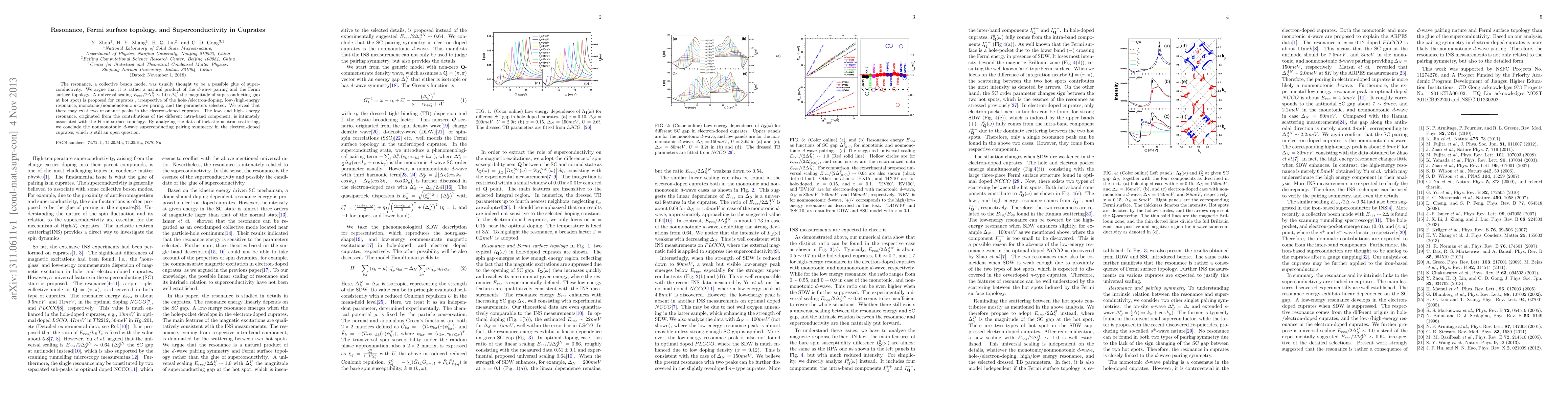This paper argues that resonance in cuprates is a consequence of d-wave pairing and Fermi surface topology, rather than a glue for superconductivity. It proposes a universal scaling relation for cuprates and suggests the existence of two resonance peaks in electron-doped cuprates, linked to their Fermi surface topology.