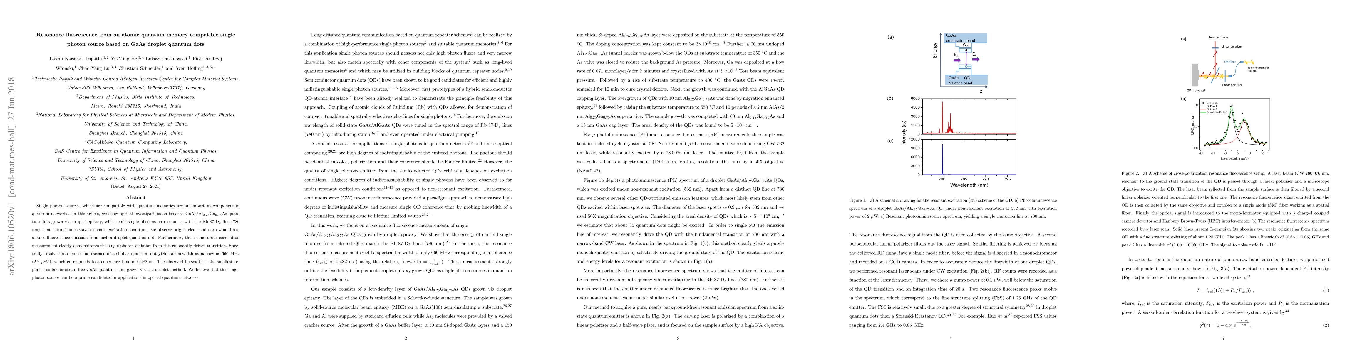 Single photon sources, which are compatible with quantum memories are an important component of quantum networks. In this article, we show optical investigations on isolated GaAs/Al$_{0.25}$Ga$_{0.75}$As quantum dots grown via droplet epitaxy, which emit single photons on resonance with the Rb-87-D$_2$ line (780 nm). Under continuous wave resonant excitation conditions, we observe bright, clean and narrowband resonance fluorescence emission from such a droplet quantum dot. Furthermore, the second-order correlation measurement clearly demonstrates the single photon emission from this resonantly driven transition. Spectrally resolved resonance fluorescence of a similar quantum dot yields a linewidth as narrow as 660 MHz ($ 2.7~\mu eV $), which corresponds to a coherence time of 0.482 ns. The observed linewidth is the smallest reported so far for strain free GaAs quantum dots grown via the droplet method. We believe that this single photon source can be a prime candidate for applications in optical quantum networks.