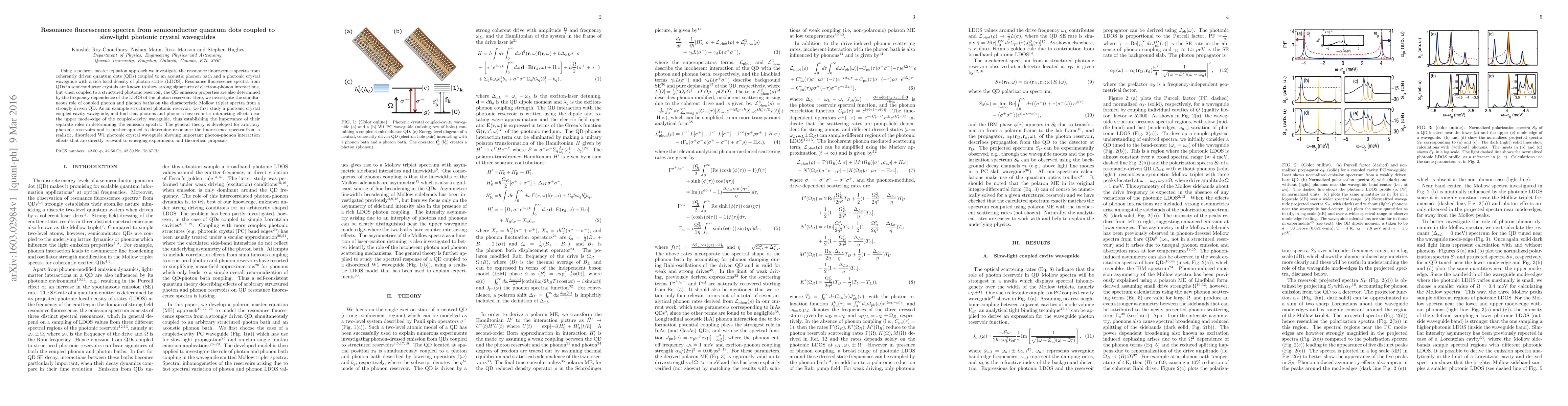 This paper investigates resonance fluorescence spectra from quantum dots driven coherently and coupled to both acoustic phonons and a photonic crystal waveguide. It finds that both photon and phonon baths significantly influence the emission properties, with counter-interacting effects near the waveguide's upper mode-edge, highlighting the importance of their separate roles in determining the emission spectra.
