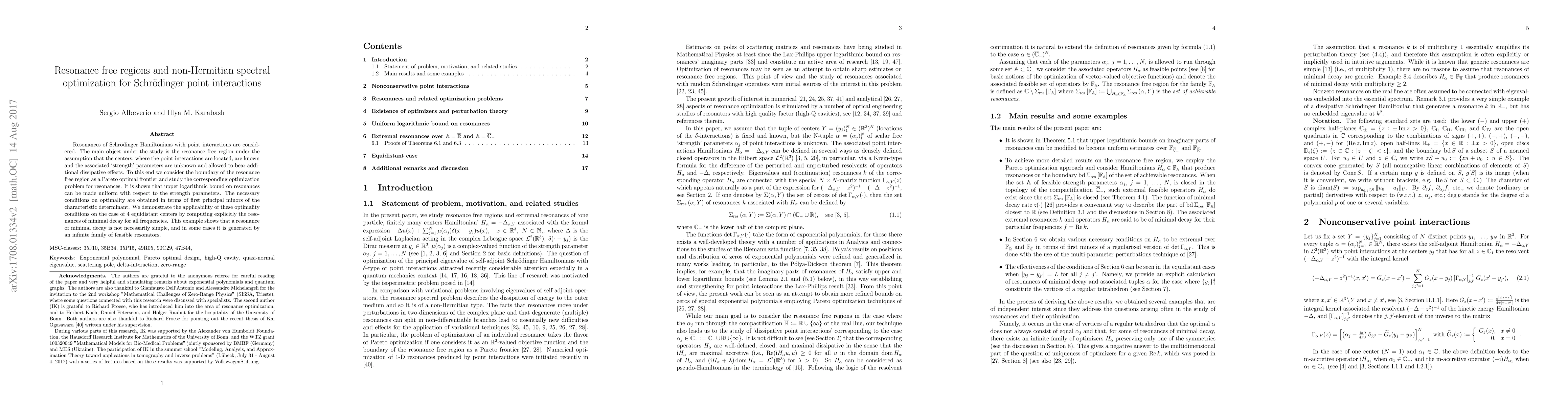 Resonances of Schr\"odinger Hamiltonians with point interactions are considered. The main object under the study is the resonance free region under the assumption that the centers, where the point interactions are located, are known and the associated 'strength' parameters are unknown and allowed to bear additional dissipative effects. To this end we consider the boundary of the resonance free region as a Pareto optimal frontier and study the corresponding optimization problem for resonances. It is shown that upper logarithmic bound on resonances can be made uniform with respect to the strength parameters. The necessary conditions on optimality are obtained in terms of first principal minors of the characteristic determinant. We demonstrate the applicability of these optimality conditions on the case of 4 equidistant centers by computing explicitly the resonances of minimal decay for all frequencies. This example shows that a resonance of minimal decay is not necessarily simple, and in some cases it is generated by an infinite family of feasible resonators.