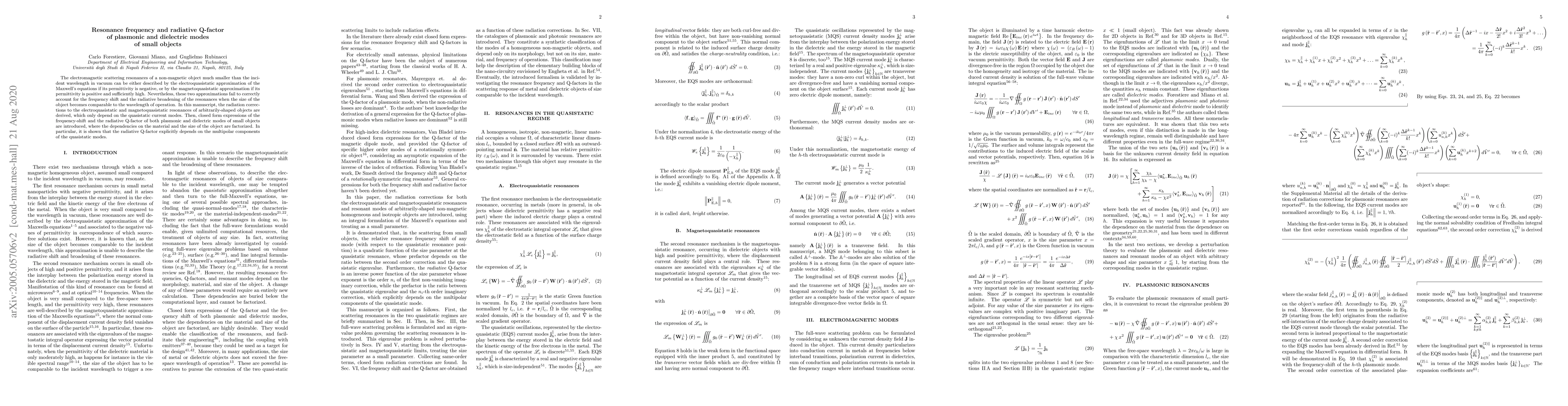 The electromagnetic scattering resonances of a non-magnetic object much smaller than the incident wavelength in vacuum can be either described by the electroquasistatic approximation of the Maxwell's equations if its permittivity is negative, or by the magnetoquasistatic approximation if its permittivity is positive and sufficiently high. Nevertheless, these two approximations fail to correctly account for the frequency shift and the radiative broadening of the resonances when the size of the object becomes comparable to the wavelength of operation. In this manuscript, the radiation corrections to the electroquasistatic and magnetoquasistatic resonances of arbitrarily-shaped objects are derived, which only depend on the quasistatic current modes. Then, closed form expressions of the frequency-shift and the radiative Q-factor of both plasmonic and dielectric modes of small objects are introduced, where the dependencies on the material and the size of the object are factorized. In particular, it is shown that the radiative Q-factor explicitly depends on the multipolar components of the quasistatic modes.
