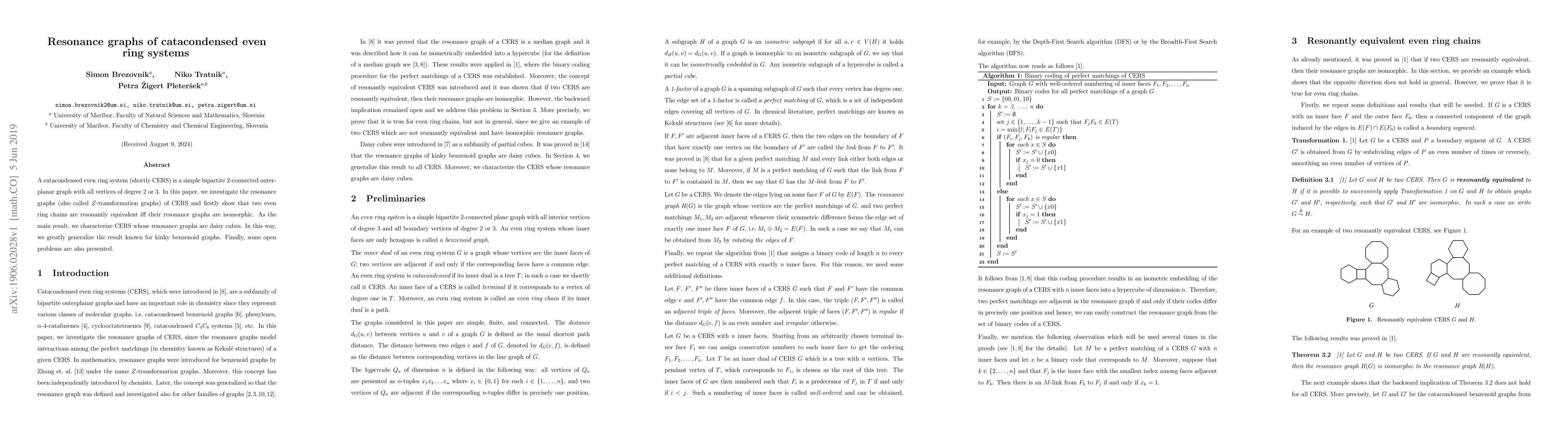This paper explores resonance graphs of catacondensed even ring systems (CERS), proving that two even ring chains are resonantly equivalent if their resonance graphs are isomorphic. The main result characterizes CERS whose resonance graphs are daisy cubes, extending known results for kinky benzenoid graphs, and concludes with some open problems for further research.