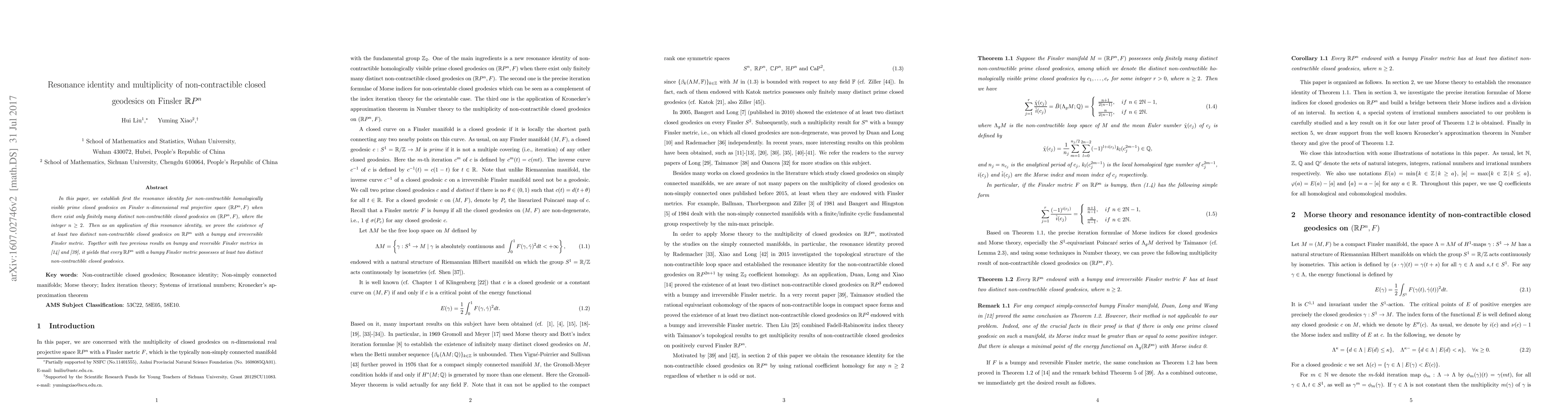 In this paper, we establish first the resonance identity for non-contractible homologically visible prime closed geodesics on Finsler $n$-dimensional real projective space $(\mathbb{R}P^n,F)$ when there exist only finitely many distinct non-contractible closed geodesics on $(\mathbb{R}P^n,F)$, where the integer $n\geq2$. Then as an application of this resonance identity, we prove the existence of at least two distinct non-contractible closed geodesics on $\mathbb{R}P^{n}$ with a bumpy and irreversible Finsler metric. Together with two previous results on bumpy and reversible Finsler metrics in \cite{DLX2015} and \cite{Tai2016}, it yields that every $\mathbb{R}P^{n}$ with a bumpy Finsler metric possesses at least two distinct non-contractible closed geodesics.