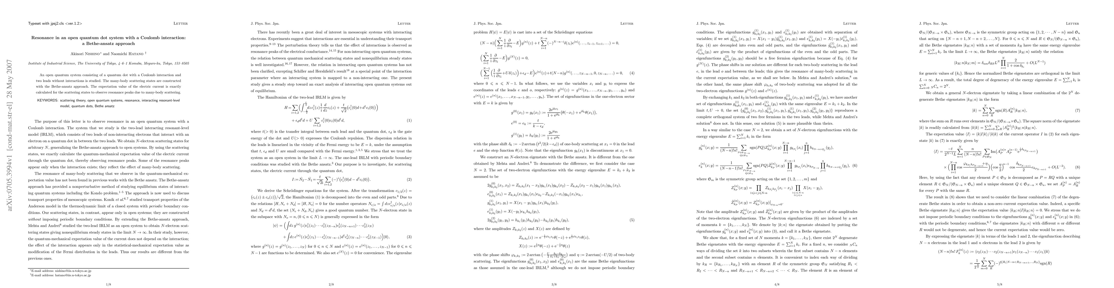This paper investigates an open quantum dot system with Coulomb interaction and two non-interacting leads using the Bethe-ansatz approach to construct many-body scattering states. It precisely calculates the electric current's expectation value to reveal resonance peaks resulting from many-body scattering effects.