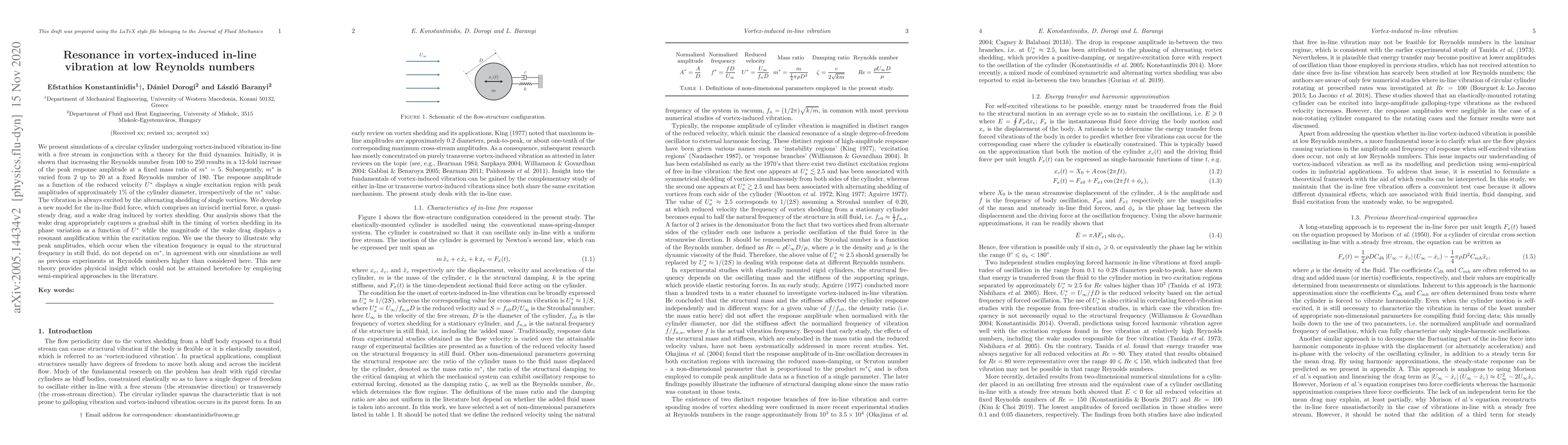 We present simulations of a circular cylinder undergoing vortex-induced vibration in-line with a free stream in conjunction with a theory for the fluid dynamics. Initially, it is shown that increasing the Reynolds number from 100 to 250 results in a 12-fold increase of the peak response amplitude at a fixed mass ratio of $m^*=5$. Subsequently, $m^*$ is varied from 2 up to 20 at a fixed Reynolds number of 180. The response amplitude as a function of the reduced velocity $U^*$ displays a single excitation region with peak amplitudes of approximately 1\% of the cylinder diameter, irrespectively of the $m^*$ value. The vibration is always excited by the alternating shedding of single vortices. We develop a new model for the in-line fluid force, which comprises an inviscid inertial force, a quasi-steady drag, and a wake drag induced by vortex shedding. Our analysis shows that the wake drag appropriately captures a gradual shift in the timing of vortex shedding in its phase variation as a function of $U^*$ while the magnitude of the wake drag displays a resonant amplification within the excitation region. We use the theory to illustrate why peak amplitudes, which occur when the vibration frequency is equal to the structural frequency in still fluid, do not depend on $m^*$, in agreement with our simulations as well as previous experiments at Reynolds numbers higher than considered here. This new theory provides physical insight which could not be attained heretofore by employing semi-empirical approaches in the literature.
