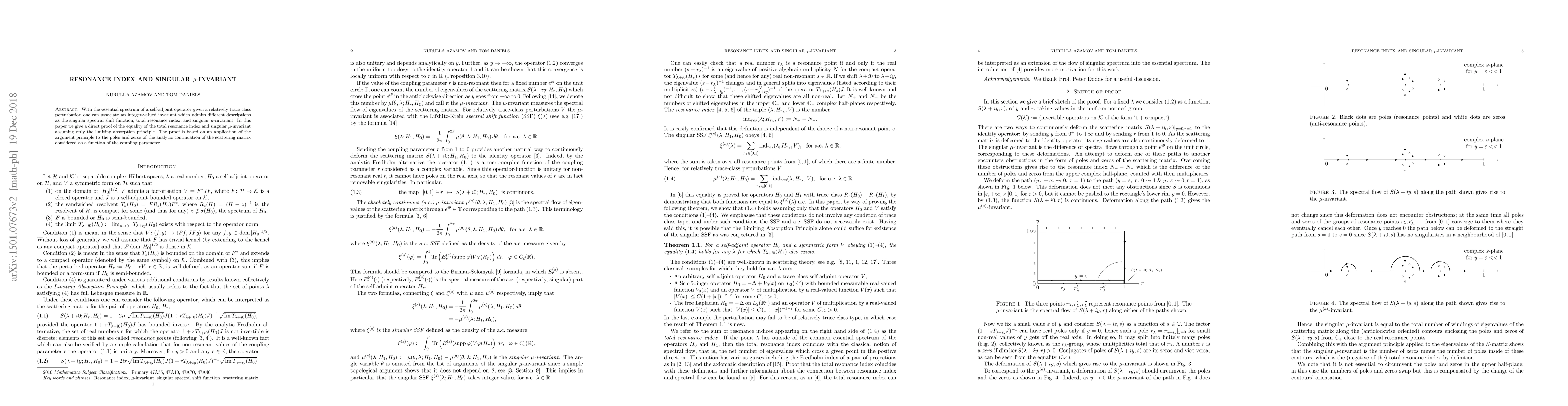 With the essential spectrum of a self-adjoint operator given a relatively trace class perturbation one can associate an integer-valued invariant which admits different descriptions as the singular spectral shift function, total resonance index, and singular $\mu$-invariant. In this paper we give a direct proof of the equality of the total resonance index and singular $\mu$-invariant assuming only the limiting absorption principle. The proof is based on an application of the argument principle to the poles and zeros of the analytic continuation of the scattering matrix considered as a function of the coupling parameter.