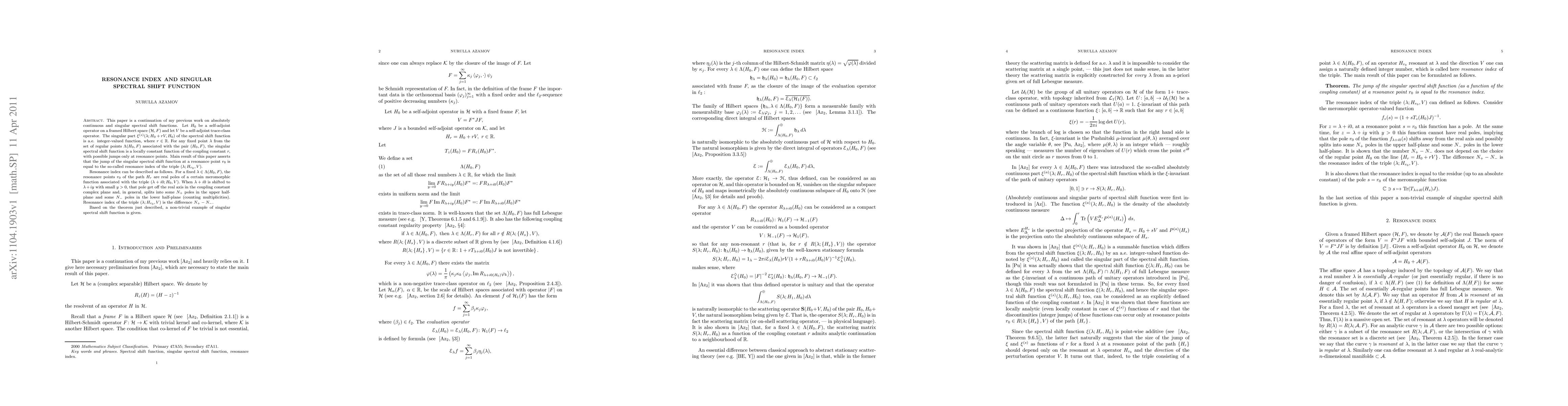 This paper extends previous work on spectral shift functions by introducing the resonance index, which quantifies the difference in the number of poles splitting into the upper and lower half-plane at resonance points. The main result shows that the jump in the singular spectral shift function at a resonance point equals the resonance index.