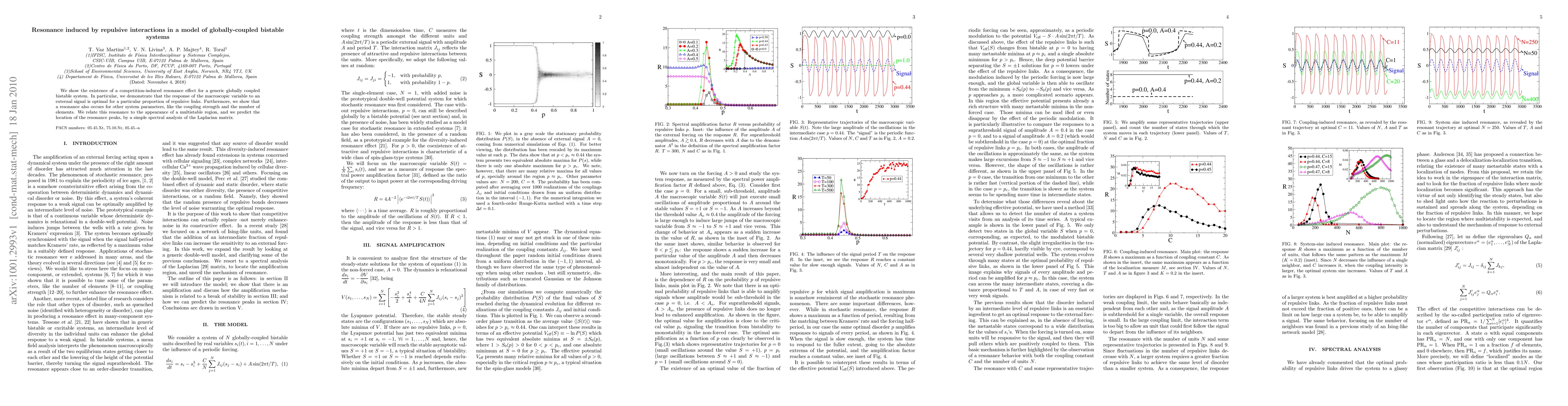 This research reveals a competition-induced resonance effect in globally coupled bistable systems, showing optimal macroscopic response to external signals under specific repulsive link proportions. The study also identifies resonance peaks related to multistability, predicted via spectral analysis of the Laplacian matrix.