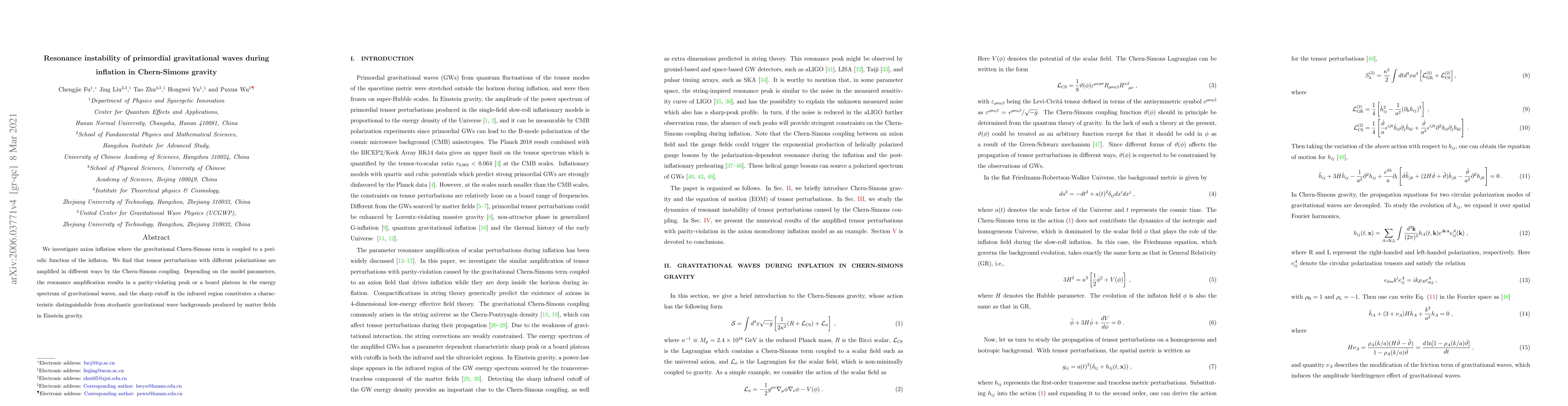 This paper explores axion inflation in the context of Chern-Simons gravity, revealing that the gravitational Chern-Simons term amplifies tensor perturbations differently, leading to either a parity-violating peak or a broad plateau in the gravitational wave spectrum, with a distinct infrared cutoff.