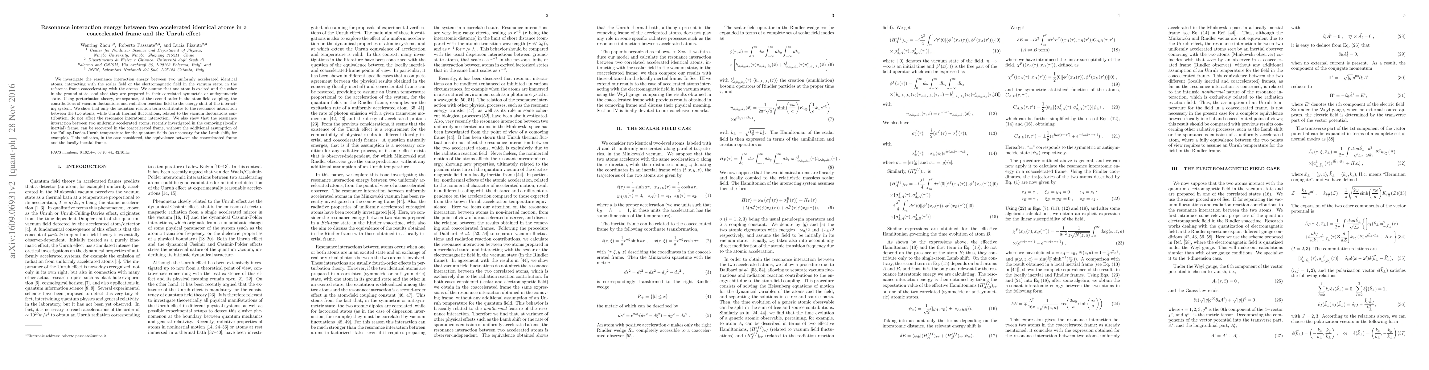 This paper examines the resonance interaction energy between two uniformly accelerated identical atoms in a coaccelerated frame, finding that only the radiation reaction term affects the interaction, while vacuum fluctuations do not. It also demonstrates equivalence between the coaccelerated and locally inertial frames for this interaction.