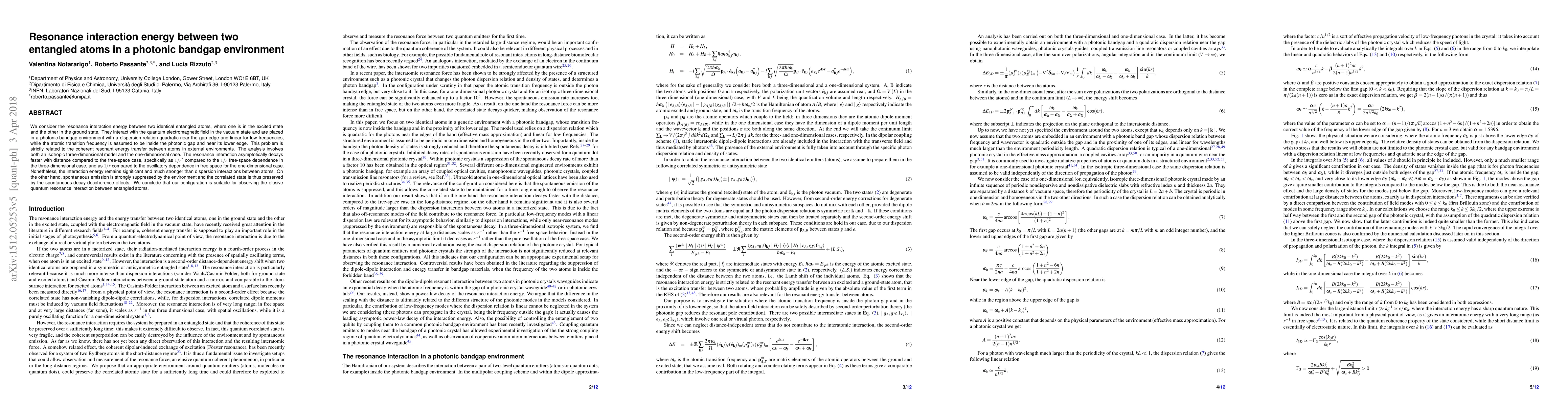 We consider the resonance interaction energy between two identical entangled atoms, where one is in the excited state and the other in the ground state. They interact with the quantum electromagnetic field in the vacuum state and are placed in a photonic-bandgap environment with a dispersion relation quadratic near the gap edge and linear for low frequencies, while the atomic transition frequency is assumed to be inside the photonic gap and near its lower edge. This problem is strictly related to the coherent resonant energy transfer between atoms in external environments. The analysis involves both an isotropic three-dimensional model and the one-dimensional case. The resonance interaction asymptotically decays faster with distance compared to the free-space case, specifically as $1/r^2$ compared to the $1/r$ free-space dependence in the three-dimensional case, and as $1/r$ compared to the oscillatory dependence in free space for the one-dimensional case. Nonetheless, the interaction energy remains significant and much stronger than dispersion interactions between atoms. On the other hand, spontaneous emission is strongly suppressed by the environment and the correlated state is thus preserved by the spontaneous-decay decoherence effects. We conclude that our configuration is suitable for observing the elusive quantum resonance interaction between entangled atoms.