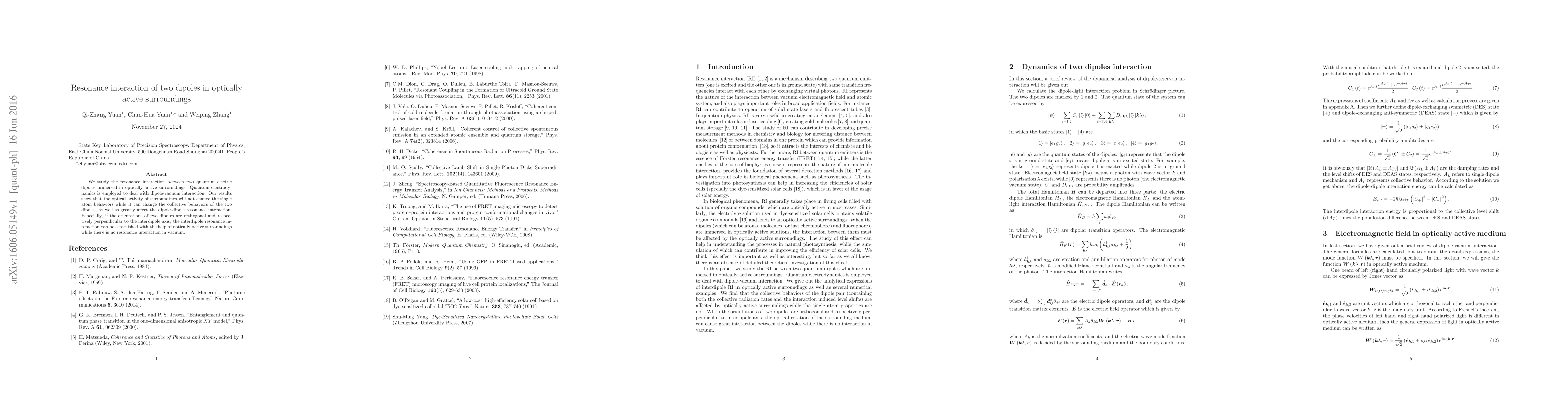 We study the resonance interaction between two quantum electric dipoles immersed in optically active surroundings. Quantum electrodynamics is employed to deal with dipole-vacuum interaction. Our results show that the optical activity of surroundings will not change the single atom behaviors while it can change the collective behaviors of the two dipoles, as well as greatly affect the dipole-dipole resonance interaction. Especially, if the orientations of two dipoles are orthogonal and respectively perpendicular to the interdipole axis, the interdipole resonance interaction can be established with the help of optically active surroundings while there is no resonance interaction in vacuum.