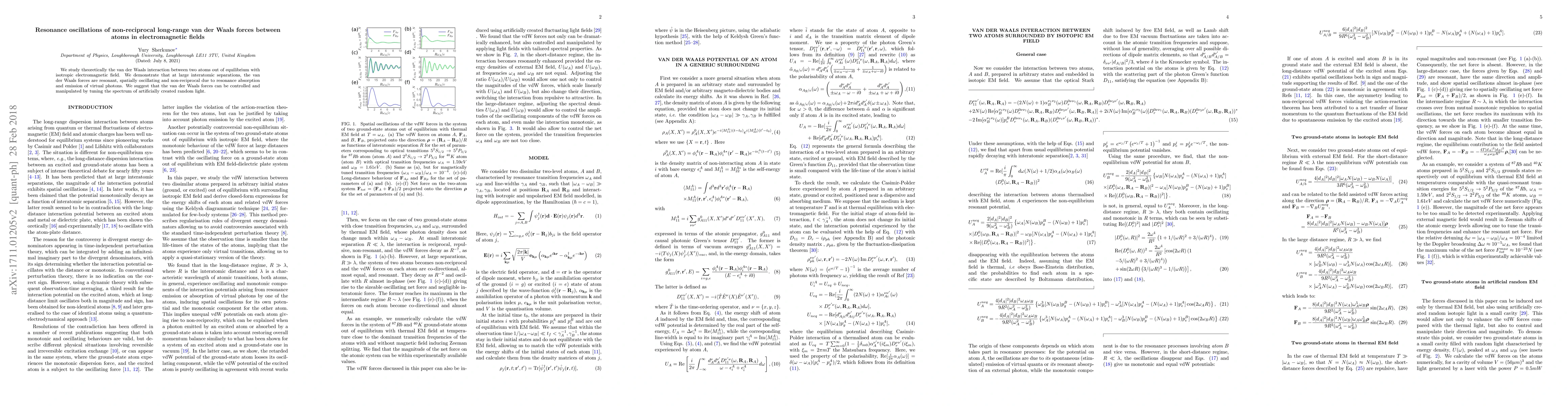This paper theoretically investigates the van der Waals interaction between two atoms under an isotropic electromagnetic field, revealing resonant, spatially oscillating, and non-reciprocal forces at large separations due to virtual photon absorption and emission. The study suggests that these forces can be controlled by adjusting the spectrum of artificial random light.