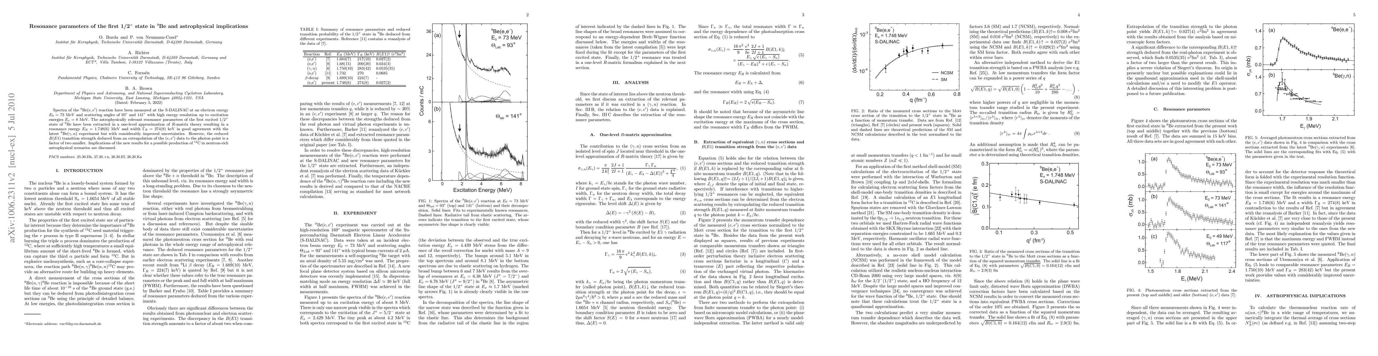 Spectra of the 9Be(e,e') reaction have been measured at the S-DALINAC at an electron energy E_0 = 73 MeV and scattering angles of 93{\deg} and 141{\deg} with high energy resolution up to excitation energies E_x = 8 MeV. The astrophysically relevant resonance parameters of the first excited 1/2+ state of 9Be have been extracted in a one-level approximation of R-matrix theory resulting in a resonance energy E_R = 1.748(6) MeV and width Gamma_R = 274(8) keV in good agreement with the latest 9Be(gamma,n) experiment but with considerably improved uncertainties. However, the reduced B(E1) transition strength deduced from an extrapolation of the (e,e') data to the photon point is a factor of two smaller. Implications of the new results for a possible production of 12C in neutron-rich astrophysical scenarios are discussed.