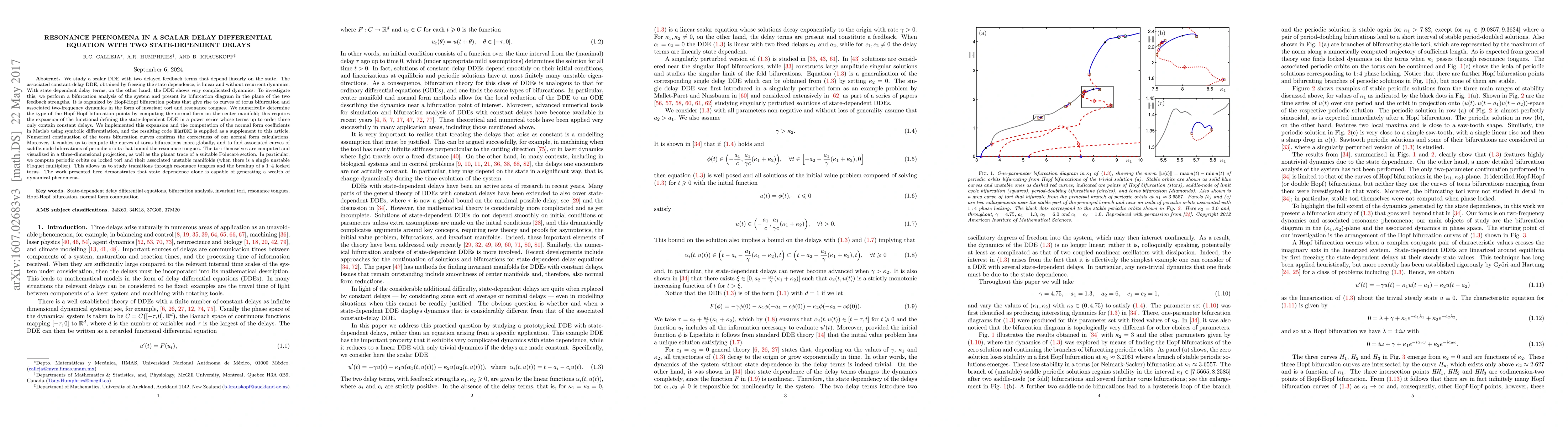 Researchers study a complex delay differential equation with state-dependent delays, finding rich dynamics that can give rise to torus bifurcations, resonance tongues, and periodic orbits, demonstrating the impact of state dependence on dynamical behavior.