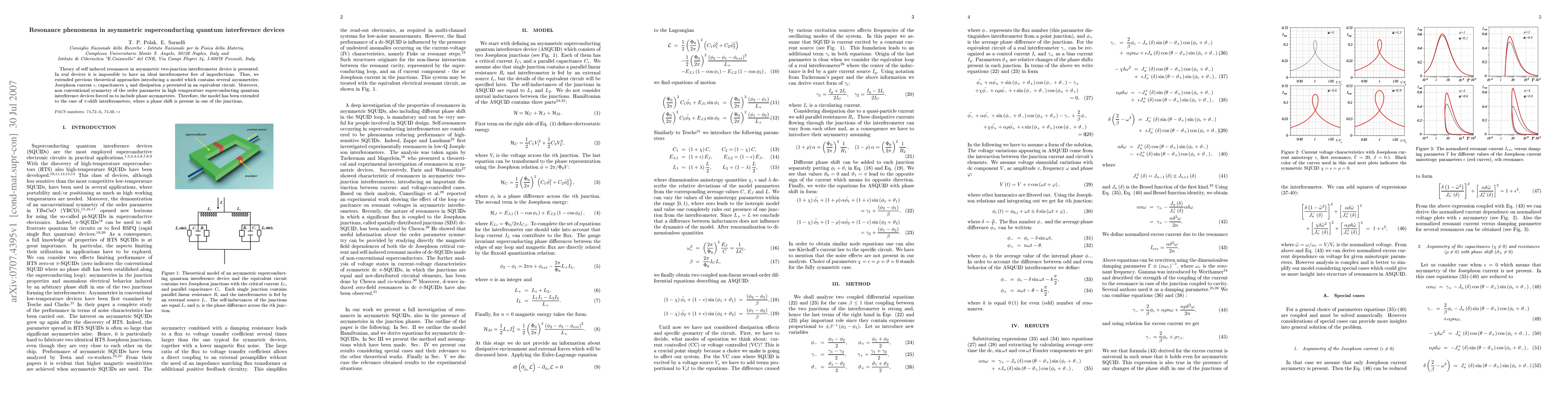 Theory of self induced resonances in asymmetric two-junction interferometer device is presented. In real devices it is impossible to have an ideal interferometer free of imperfections. Thus, we extended previous theoretical approaches introducing a model which contains several asymmetries: Josephson current $\epsilon$, capacitances $\chi$ and dissipation $\rho$ presented in an equivalent circuit. Moreover, non conventional symmetry of the order parameter in high temperature superconducting quantum interference devices forced us to include phase asymmetries. Therefore, the model has been extended to the case of $\pi$-shift interferometers, where a phase shift is present in one of the junctions.