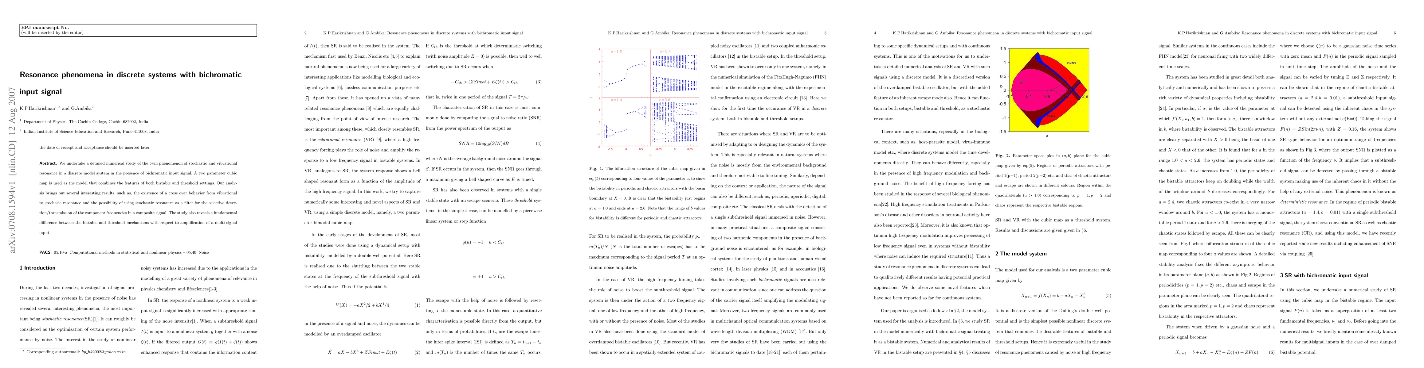 We undertake a detailed numerical study of the twin phenomena of stochastic and vibrational resonance in a discrete model system in the presence of bichromatic input signal. A two parameter cubic map is used as the model that combines the features of both bistable and threshold settings. Our analysis brings out several interesting results, such as, the existence of a cross over behaviour from vibrational to stochastic resonance and the possibility of using stochastic resonance as a filter for the selective detection/transmission of the component frequencies in a composite signal. The study also reveals a fundamental difference between the bistable and threshold mechanisms with respect to amplification of a multi signal input.