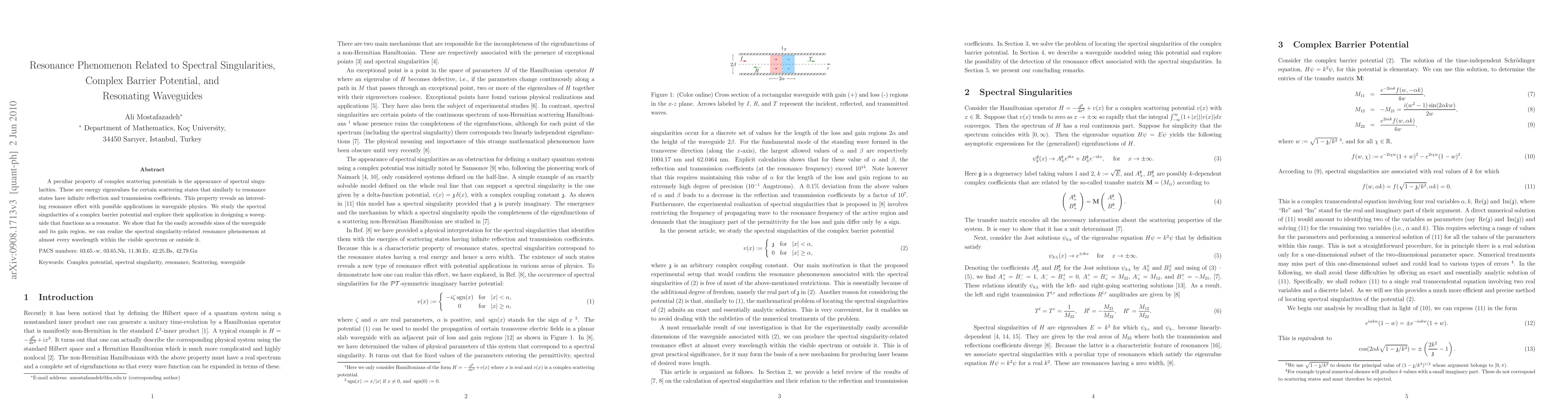 This paper investigates spectral singularities in complex scattering potentials, demonstrating their resonance properties akin to those of waveguide resonators. The study explores these singularities in a complex barrier potential and proposes their use in designing waveguides that exhibit resonant behavior across various wavelengths, including the visible spectrum.