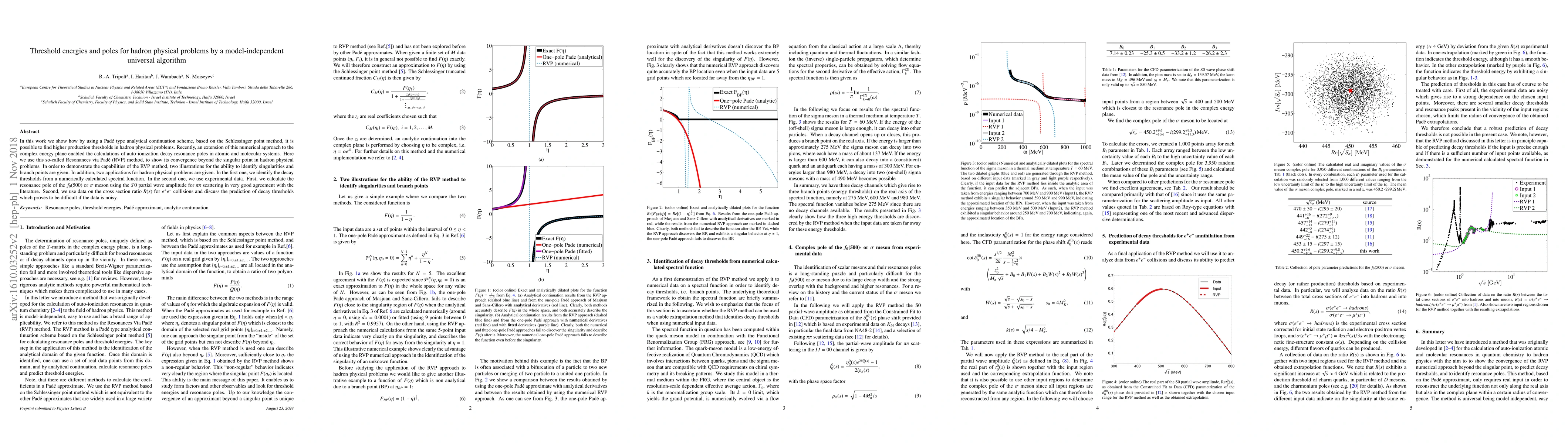 This paper introduces a model-independent universal algorithm based on Padé-approximant to accurately determine complex resonance poles and threshold energies in hadron physics from real spectral data. The method is demonstrated with analytical models and experimental data for pion form factors, $\pi\pi$ scattering, and $e^+e^-$ collision cross sections, showing good agreement with literature values for resonances like $\rho(770)$ and $f_0(500)$.