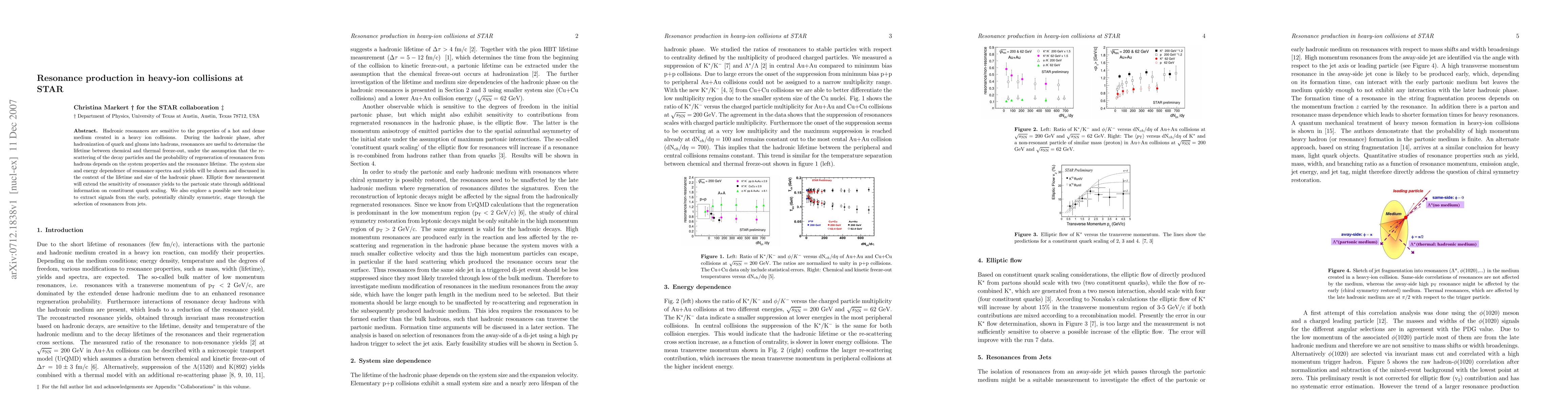 Hadronic resonances are sensitive to the properties of a hot and dense medium created in a heavy ion collisions. During the hadronic phase, after hadronization of quark and gluons into hadrons, resonances are useful to determine the lifetime between chemical and thermal freeze-out, under the assumption that the re-scattering of the decay particles and the probability of regeneration of resonances from hadrons depends on the system properties and the resonance lifetime. The system size and energy dependence of resonance spectra and yields will be shown and discussed in the context of the lifetime and size of the hadronic phase. Elliptic flow measurement will extend the sensitivity of resonance yields to the partonic state through additional information on constituent quark scaling. We also explore a possible new technique to extract signals from the early, potentially chirally symmetric, stage through the selection of resonances from jets.