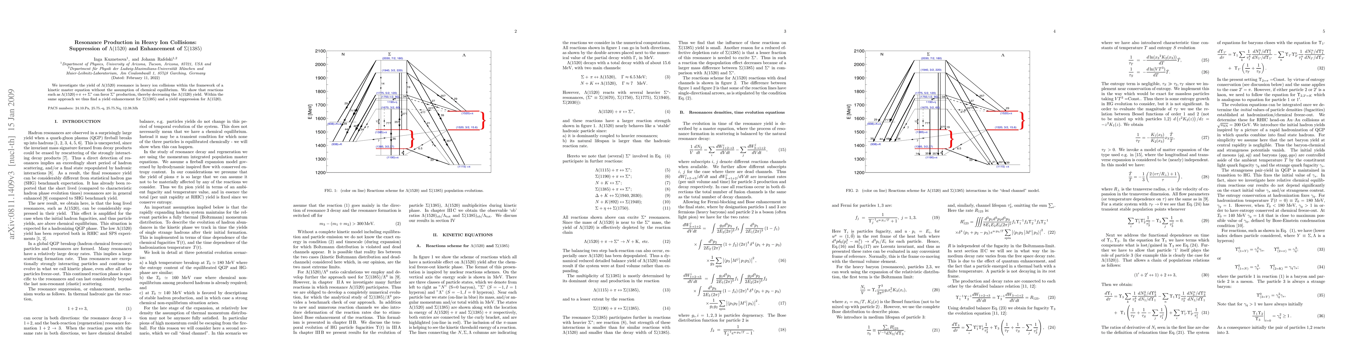 This study investigates the production dynamics of $\Lambda(1520)$ and $\Sigma(1385)$ in heavy ion collisions using a kinetic master equation, revealing a suppression of $\Lambda(1520)$ and an enhancement of $\Sigma(1385)$ due to reaction processes favoring $\Sigma^*$ production.