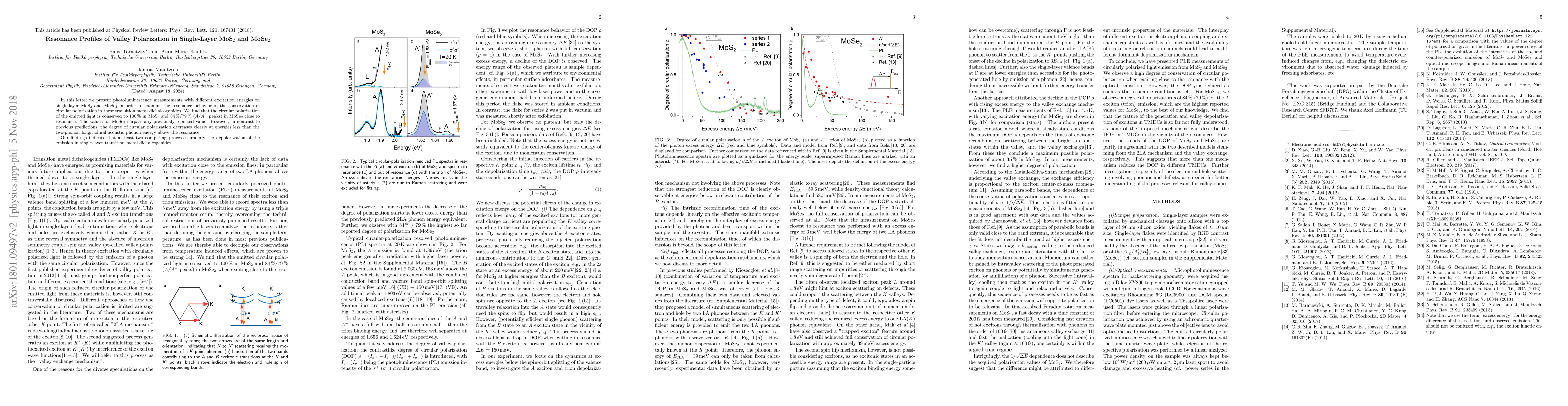 This paper investigates the resonance behavior of valley polarization in single-layer MoS$_2$ and MoSe$_2$ using photoluminescence measurements. It finds that MoS$_2$ maintains 100% circular polarization, while MoSe$_2$ exhibits 84% and 79% for A and A$^-$ peaks, surpassing previous reports, but shows a decrease in polarization below the two-phonon longitudinal acoustic phonon energy, indicating two competing depolarization processes.