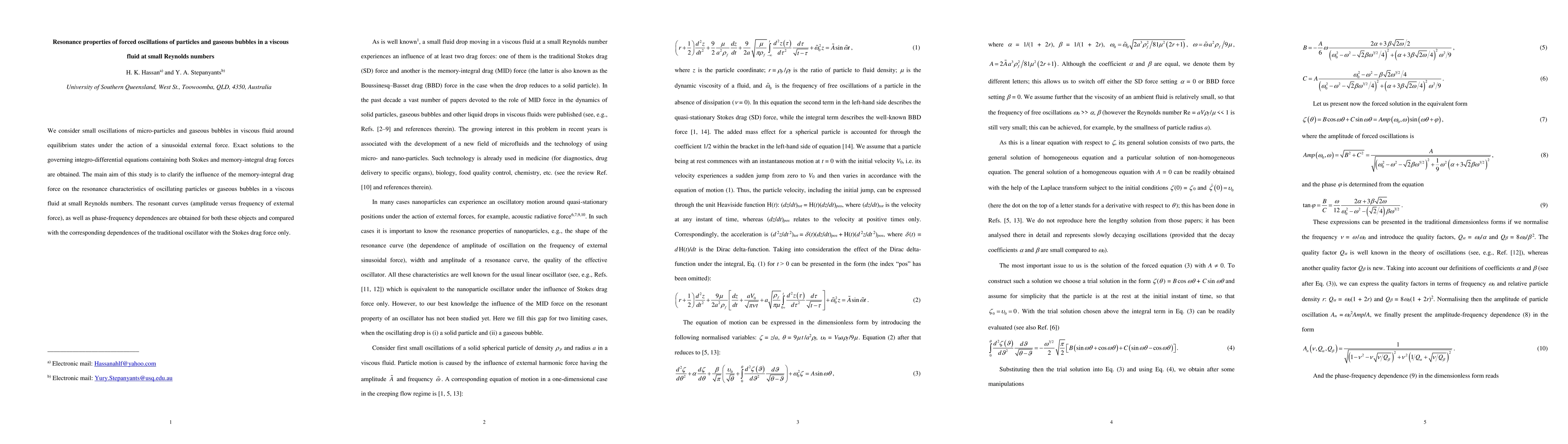 We consider small oscillations of micro-particles and gaseous bubbles in viscous fluid around equilibrium states under the action of a sinusoidal external force. Exact solutions to the governing integro-differential equations containing both Stokes and memory-integral drag forces are obtained. The main aim of this study is to clarify the influence of the memory-integral drag force on the resonance characteristics of oscillating particles or gaseous bubbles in a viscous fluid at small Reynolds numbers. The resonant curves (amplitude versus frequency of external force), as well as phase-frequency dependences are obtained for both these objects and compared with the corresponding dependences of the traditional oscillator with the Stokes drag force only.
