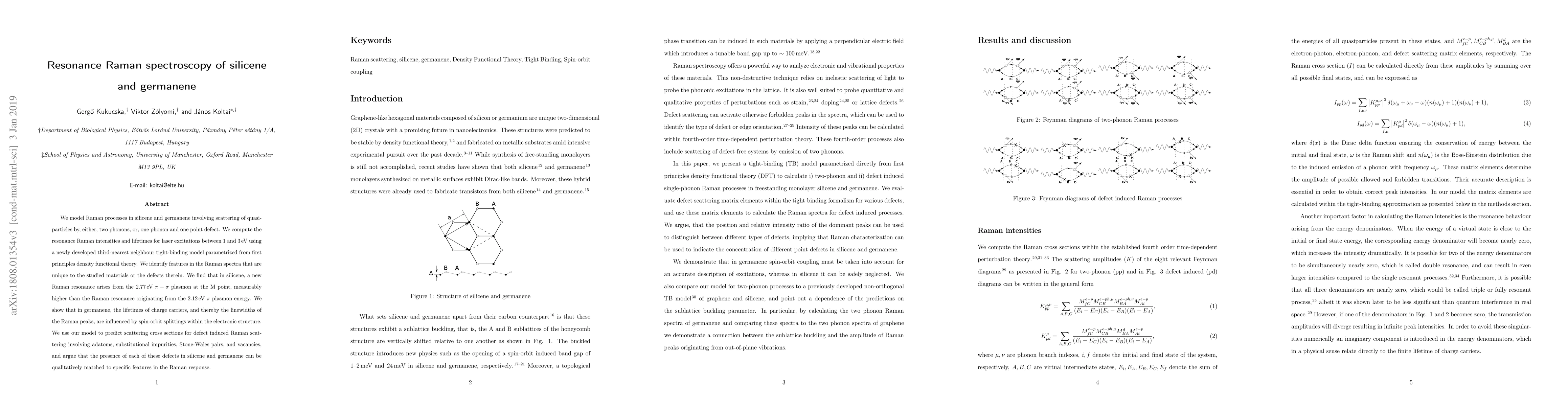 This study models Raman processes in silicene and germanene, revealing unique spectral features due to quasiparticle interactions with phonons and defects. It identifies a new Raman resonance in silicene linked to a higher energy plasmon and shows that germanene's Raman peaks are influenced by spin-orbit splittings, predicting defect-induced scattering cross sections.