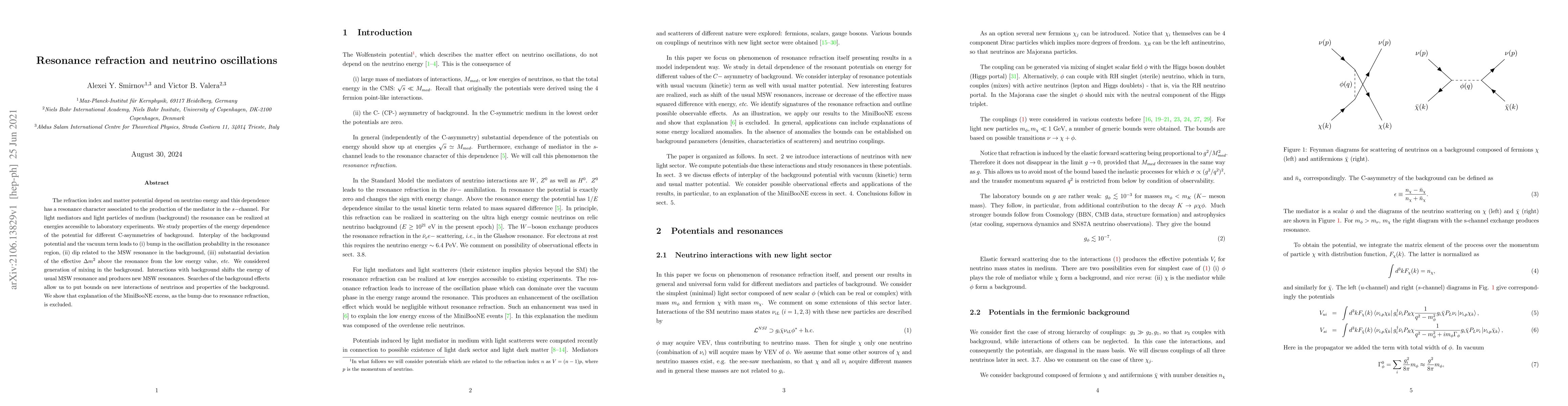 The refraction index and matter potential depend on neutrino energy and this dependence has a resonance character associated to the production of the mediator in the $s-$channel. For light mediators and light particles of medium (background) the resonance can be realized at energies accessible to laboratory experiments. We study properties of the energy dependence of the potential for different C-asymmetries of background. Interplay of the background potential and the vacuum term leads to (i) bump in the oscillation probability in the resonance region, (ii) dip related to the MSW resonance in the background, (iii) substantial deviation of the effective $\Delta m^2$ above the resonance from the low energy value, etc. We considered generation of mixing in the background. Interactions with background shifts the energy of usual MSW resonance and produces new MSW resonances. Searches of the background effects allow us to put bounds on new interactions of neutrinos and properties of the background. We show that explanation of the MiniBooNE excess, as the bump due to resonance refraction, is excluded.