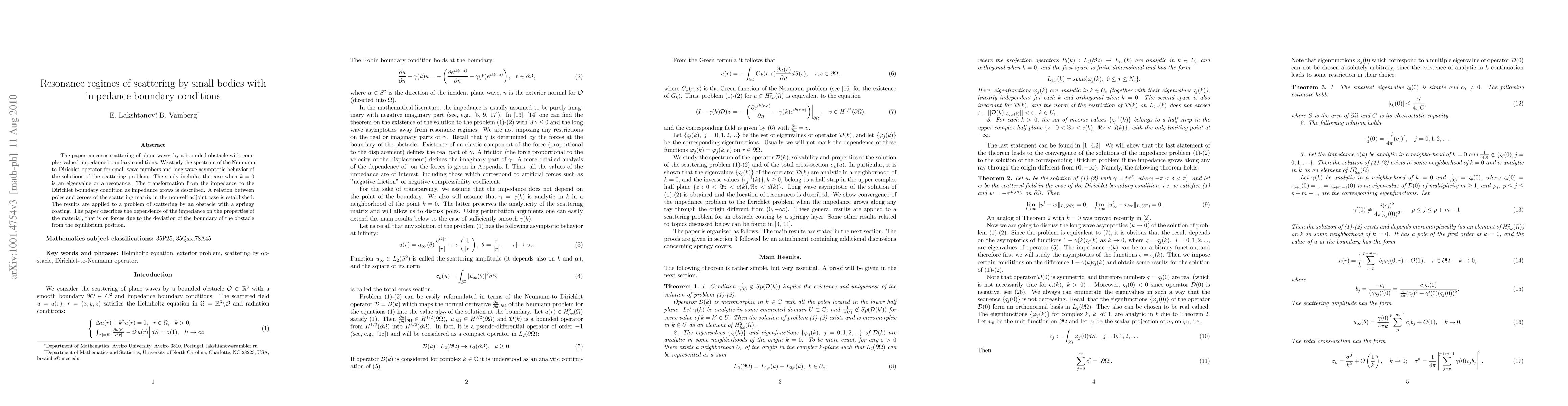 This paper investigates scattering phenomena by small obstacles with complex impedance boundary conditions, focusing on the spectrum of the Neumann-to-Dirichlet operator, resonance regimes, and the transformation from impedance to Dirichlet conditions. It establishes a relationship between poles and zeroes of the scattering matrix and applies these findings to scattering by an obstacle with a springy coating.