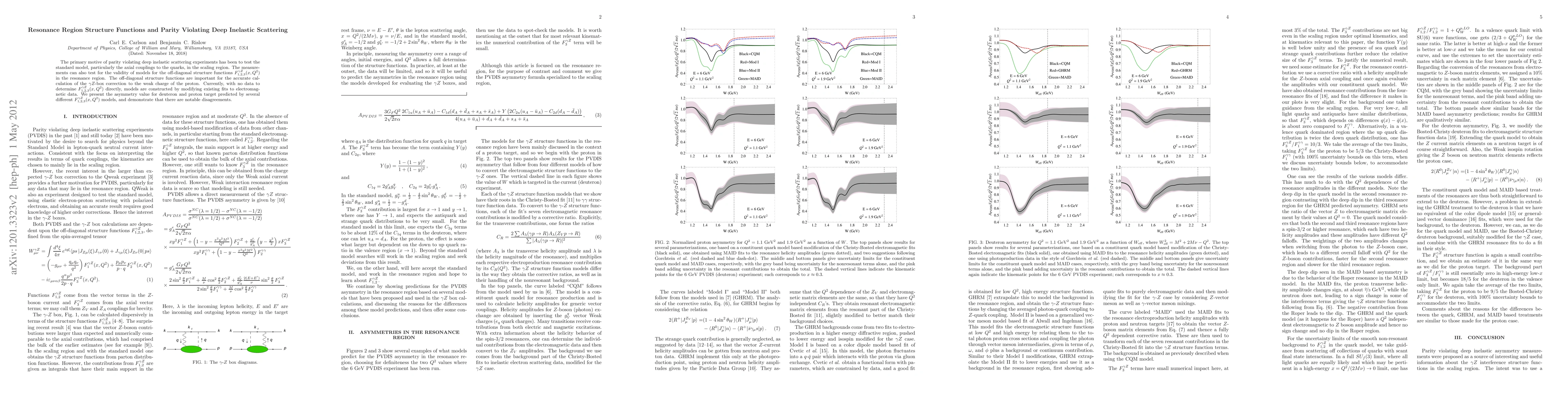 This paper investigates the resonance region structure functions in parity violating deep inelastic scattering experiments to test the standard model's axial couplings and the validity of models for off-diagonal structure functions. It highlights significant discrepancies among various models predicting the asymmetry values for deuteron and proton targets.