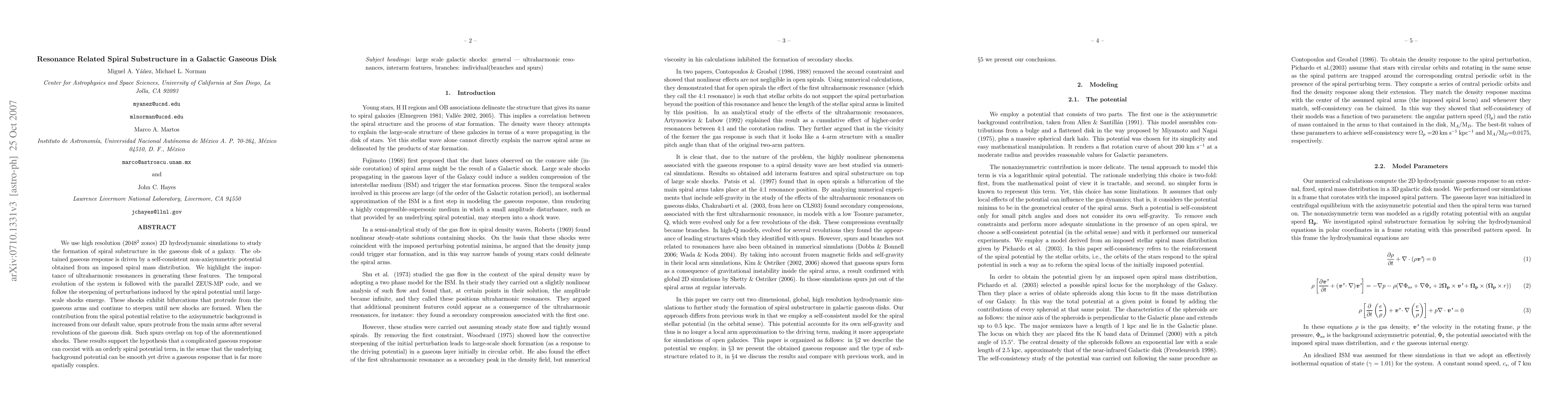 We use high resolution 2D hydrodynamic simulations to study the formation of spiral substructure in the gaseous disk of a galaxy. The obtained gaseous response is driven by a self-consistent non-axisymmetric potential obtained from an imposed spiral mass distribution. We highlight the importance of ultraharmonic resonances in generating these features. The temporal evolution of the system is followed with the parallel ZEUS-MP code, and we follow the steepening of perturbations induced by the spiral potential until large-scale shocks emerge. These shocks exhibit bifurcations that protrude from the gaseous arms and continue to steepen until new shocks are formed. When the contribution from the spiral potential relative to the axisymmetric background is increased from our default value, spurs protrude from the main arms after several revolutions of the gaseous disk. Such spurs overlap on top of the aforementioned shocks. These results support the hypothesis that a complicated gaseous response can coexist with an orderly spiral potential term, in the sense that the underlying background potential can be smooth yet drive a gaseous response that is far more spatially complex.