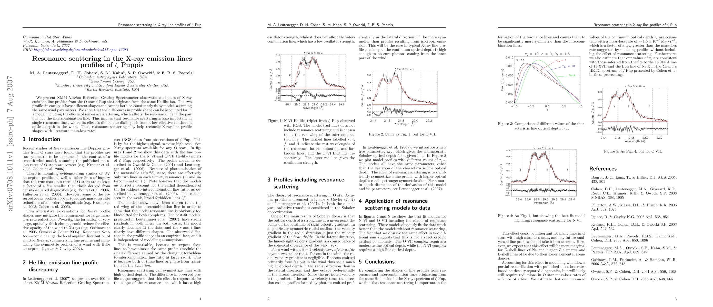 Resonance scattering affects X-ray emission line profiles of O star Zeta Pup, altering profile shapes that cannot be explained by current models, suggesting resonance scattering plays a role in reconciling mass-loss rates with observed line profiles.