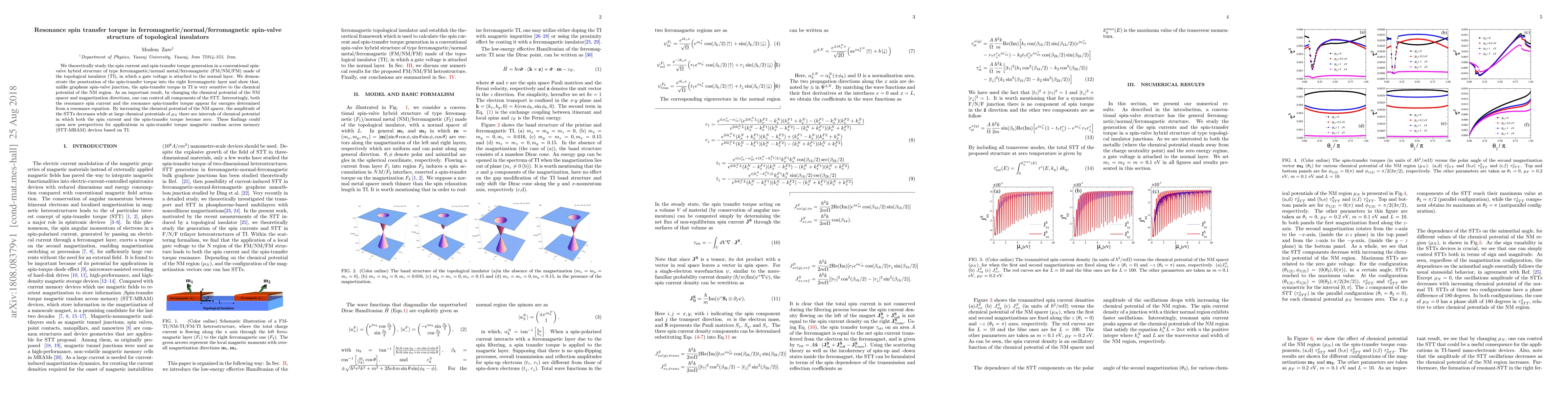 We theoretically study the spin current and spin-transfer torque generation in a conventional spin- valve hybrid structure of type ferromagnetic/normal metal/ferromagnetic (FM/NM/FM) made of the topological insulator (TI), in which a gate voltage is attached to the normal layer. We demonstrate the penetration of the spin-transfer torque into the right ferromagnetic layer and show that, unlike graphene spin-valve junction, the spin-transfer torque in TI is very sensitive to the chemical potential of the NM region. As an important result, by changing the chemical potential of the NM spacer and magnetization directions, one can control all components of the STT. Interestingly, both the resonance spin current and the resonance spin-transfer torque appear for energies determined from a resonance equation. By increasing the chemical potential of the NM spacer, the amplitude of the STTs decreases while at large chemical potentials of $\mu_N$ there are intervals of chemical potential in which both the spin current and the spin-transfer torque become zero. These findings could open new perspectives for applications in spin-transfer torque magnetic random access memory (STT-MRAM) devices based on TI.